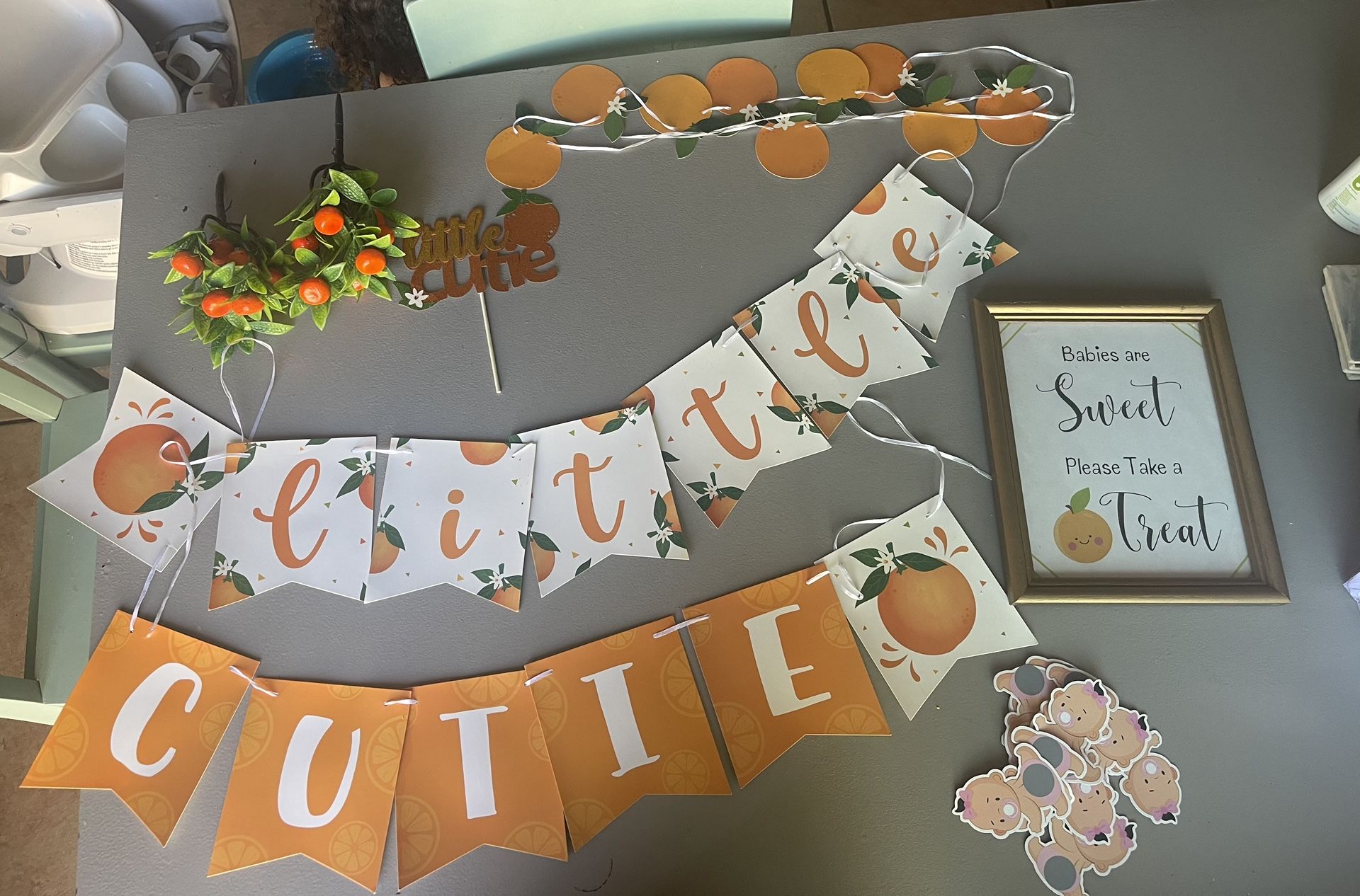 Included is a huge poster made of a cloth like thick material measuring at 81inches wide and 60 inches tall, 18 lottery scratcher tickets with one winner who uncovers the poop emoji, 2 small fake tangerine trees, an 8x10 frame with sign, a cake topper, and 3 banners. I’m located near Bonita off the 54 freeway Briarwood exit 92139