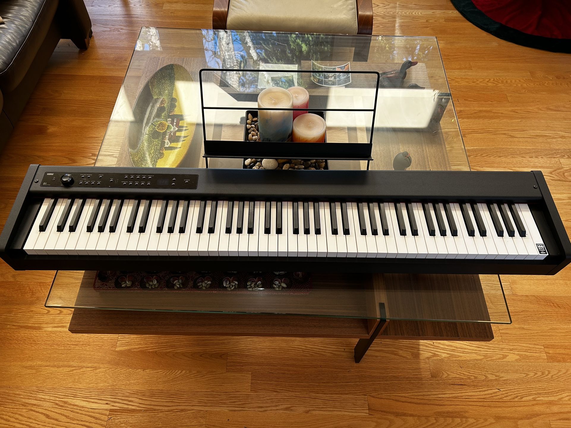 I am selling my Korg D1 digital piano which is in mint conditions. It is a stage digital piano with no speakers but with great sound through headphones (front connector) or 1/4” TRS cables. It is also has midi connectors. Its keybed is the best that Korg offers and one of the best in the market. It is graded and allows for a lot of dynamic control. It is built like a tank. Its body is constructed from metal. I bought it in Japan and the price includes a power adapter (white device in pictures) for US outlets. It retails new for $999 + 100 in taxes = ~$1,100