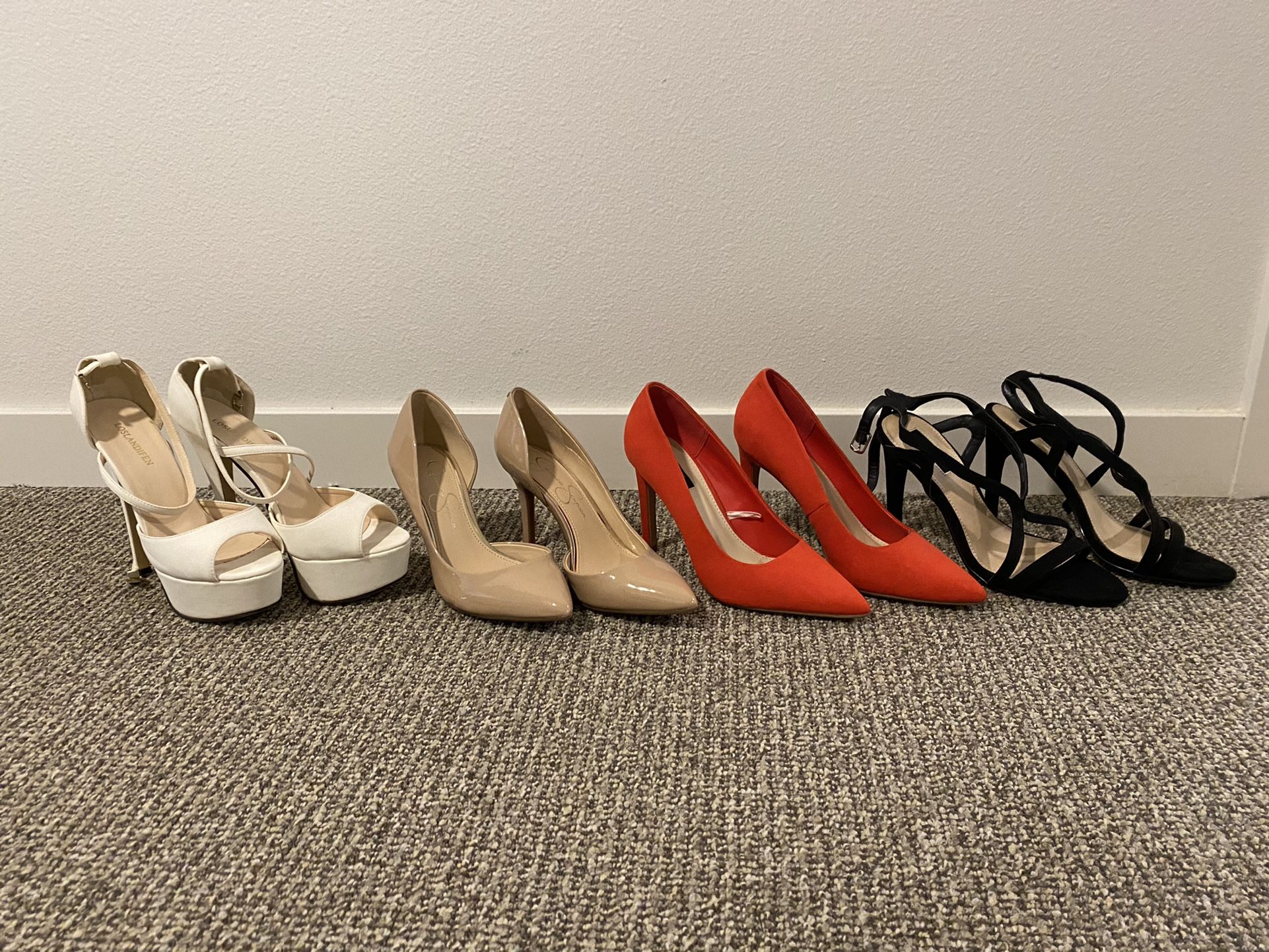 Beige (Jessica Simpson) size 6.5 - worn couple times Red (Forever 21) size 6 - brand new Black (Forever 21) size 7 - worn couple times White (unknown brand) - size 7 - never worn Asking $60 for all of them or $15 each ($20 for the beige ones); Pick up in Redmond town center.