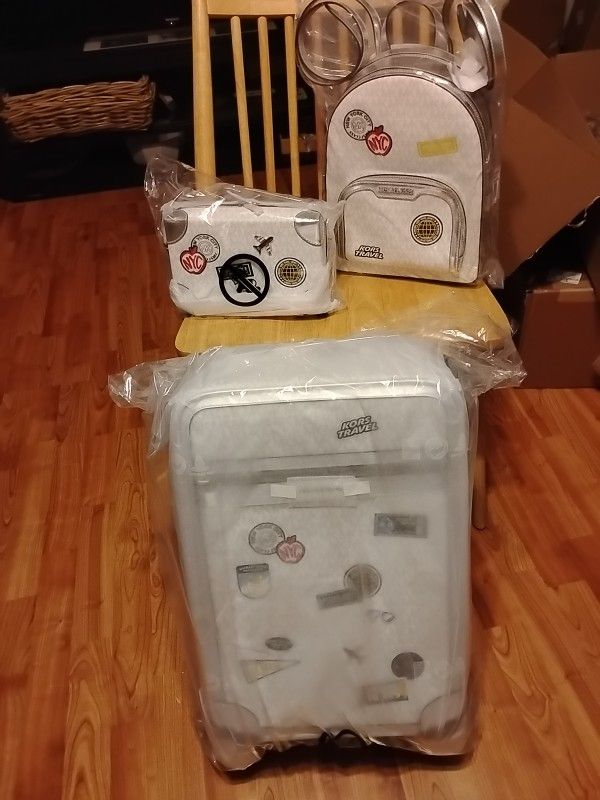 BRAND NEW AND SEALED MICHAEL KORS JET SET TRAVEL LUGGAGE SET THREE-PIECE INCLUDES OPTIC WHITE TRAVEL TROLLEY MATCHING CROSSBODY PURSE MATCHING BACKPACK PLEASE SEE ALL PHOTOS AND ASK ANY QUESTIONS PRICES FIRM