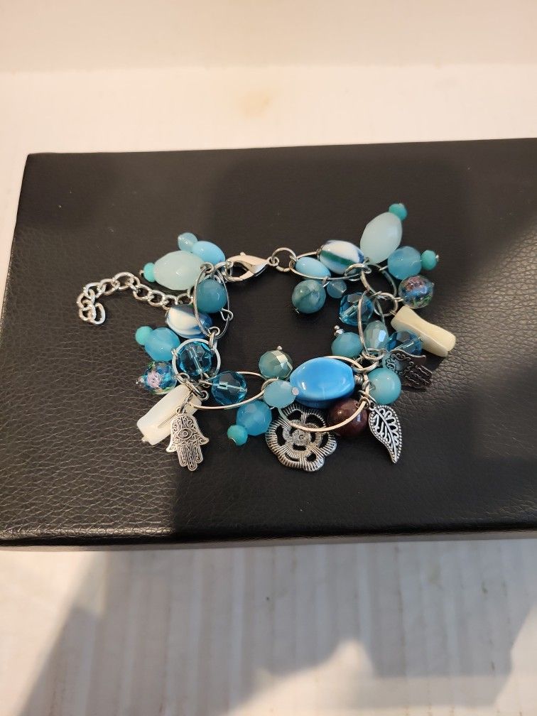 Silvertone Aqua Blue Glass Beaded Bracelet Dangle Charms Pre-Owned in Great Condition Please View Photos For Details Cash Only Please!