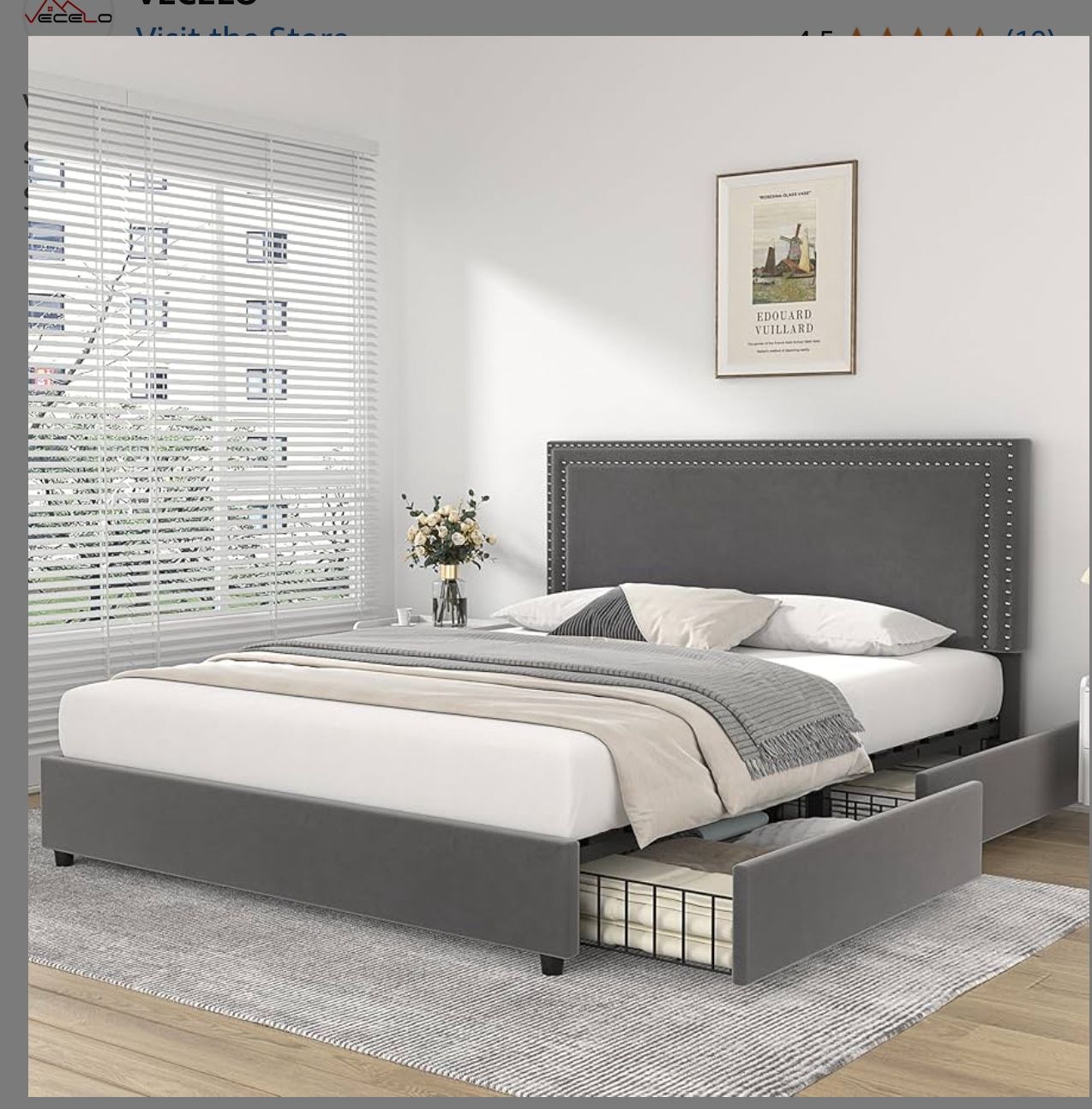 Queen sized bed frame with 4 adjustable storage drawers on wheels, adjustable headboard, no box spring needed. Super easy assembly. Slightly used - less than one year. Smoke free pet free home.
