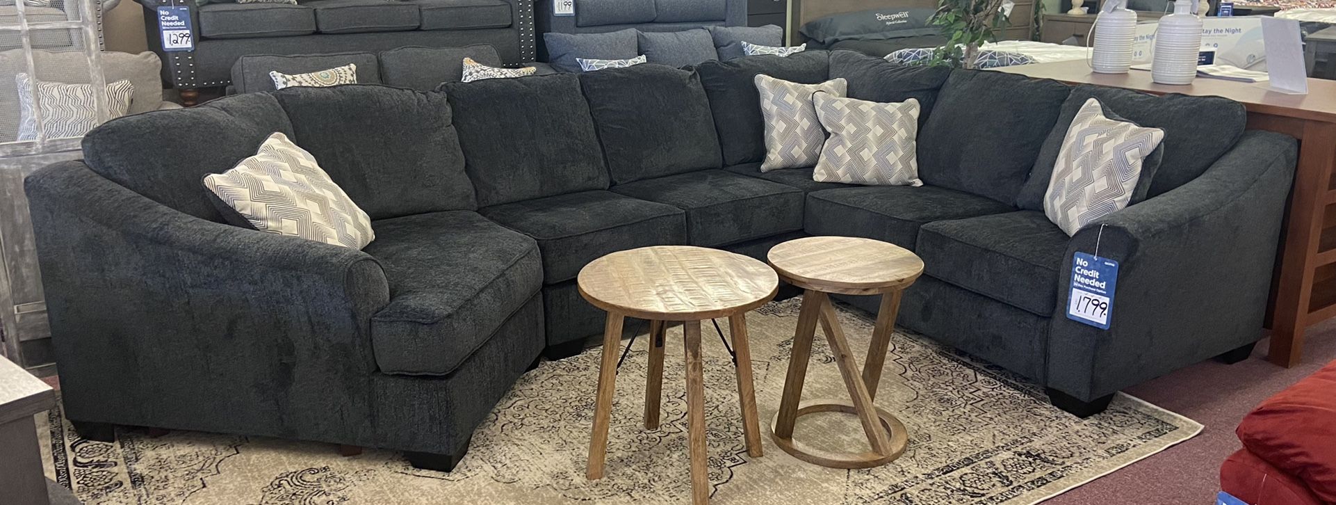 $1799 Sectional with matching pillows Add to any room $148 Floor Rug or $168 Lamps, $300 for both Fast delivery, instant approval financing, 90 days same as cash financing option $50 Down Takes It Home Financing, balance set up on auto-pay Large selection available on our website and in our showroom! Follow Me for a larger selection! Also in-stock Bedrooms, Dining Rooms, Office Furniture, Children’s Furniture, Mattresses, Accents also available.