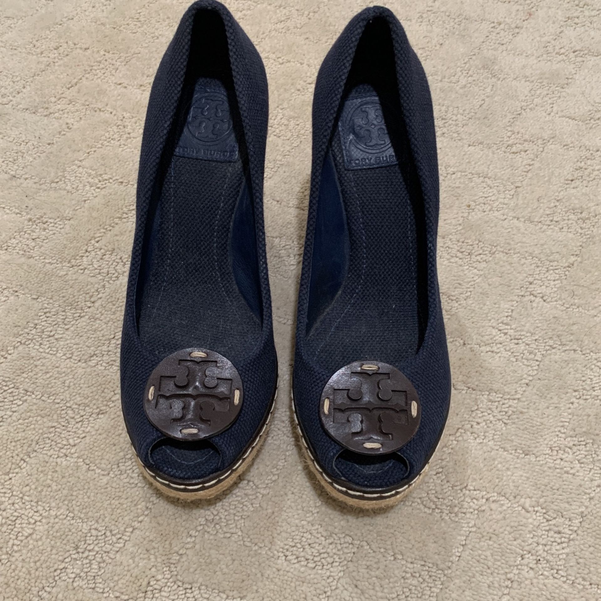 Women’s navy blue Tory Burch peep toe wedge heel shoes with brown logo size US 8.