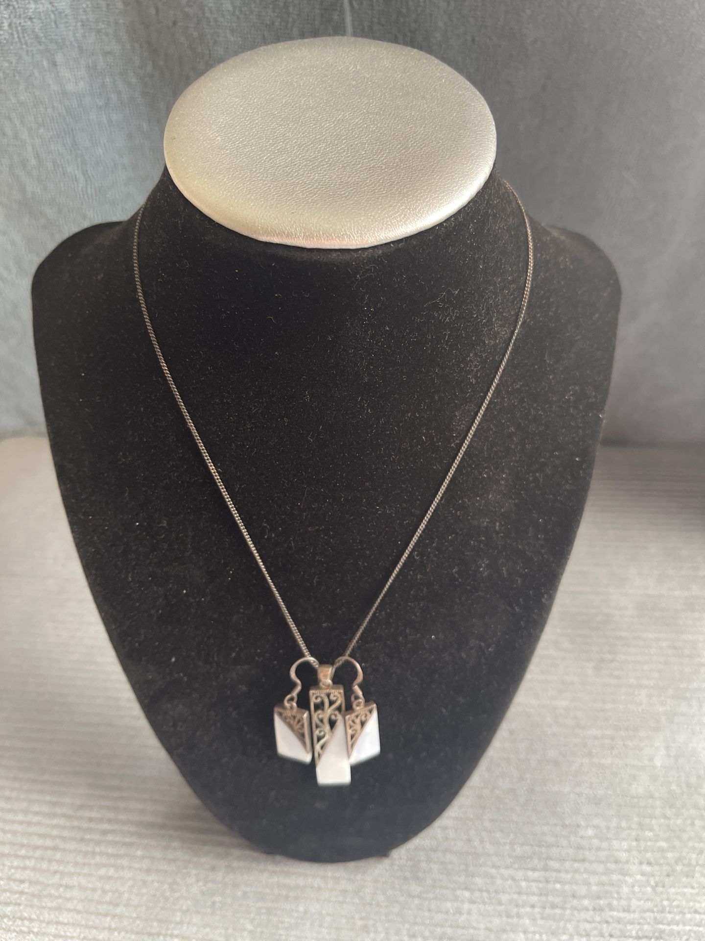 This set includes a pendant necklace and matching earrings in a cohesive design. Silver-tone metal features decorative filigree with geometric mother-of-pearl accents. Stylish and refined, suitable for everyday wear or special occasions. Very good condition with no noticeable damage. A lovely gift option.