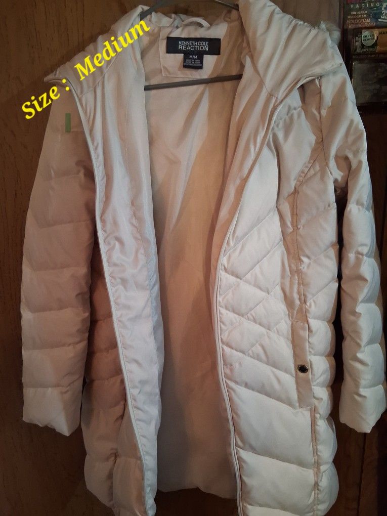 Off white long Kenneth Cole winter coat with a fur hood size mediun
