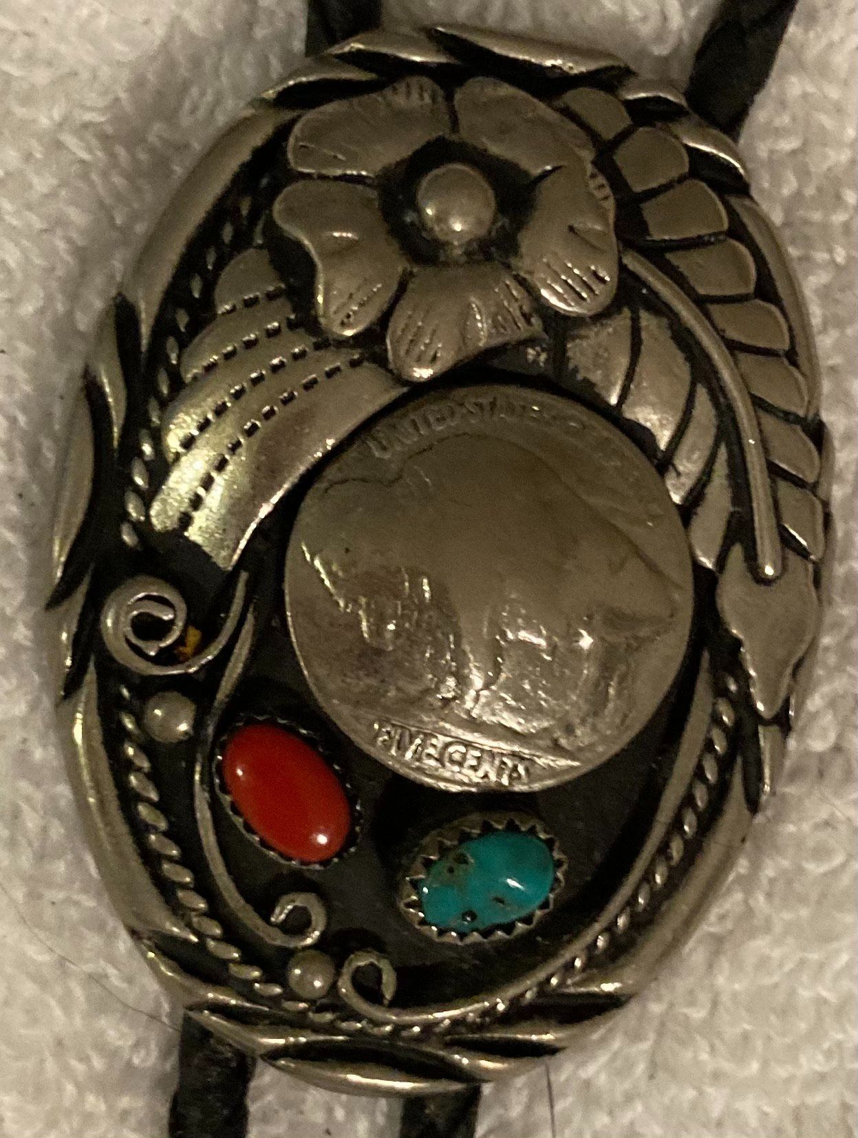 Vintage Metal Bolo Tie, Nice Silver and Red and Blue Turquoise Stones Design, Buffalo Nickel, Native, Nice Western Design, 2 1/4" x 1 3/4", Quality, H