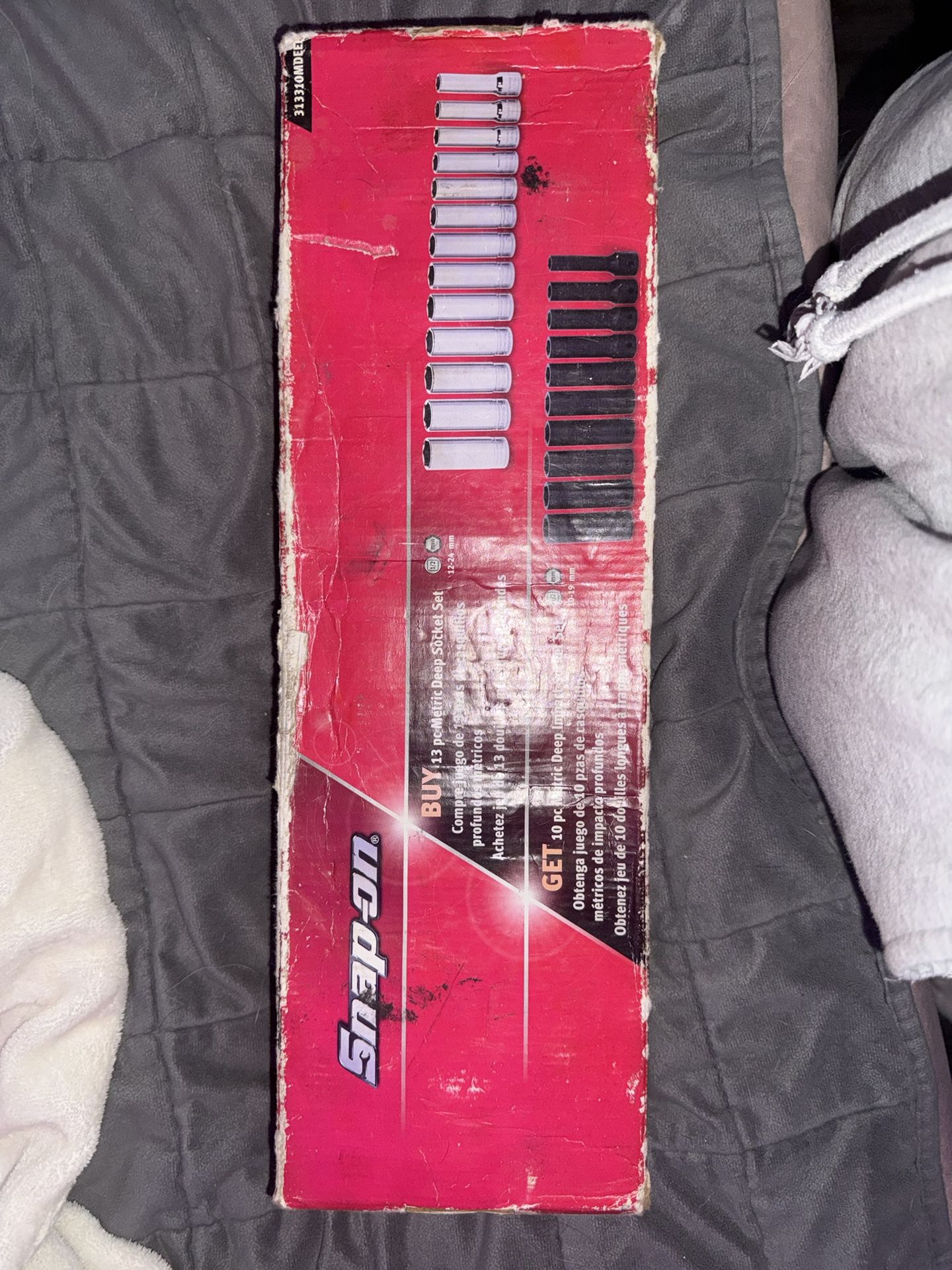 Snap-on 23 Piece Combo / Set Builder | 1/2" Drive Metric | Deep Chrome + Deep Impact Socket Sets Item # 313310MDEEP (Includes: Item # 313TSMYA | 13 pc 1/2" Drive 6-Point Metric Flank Drive Deep Socket Set | 12mm - 24 mm) $577 Value (Item # 310SIMMYA | 10 pc 1/2" Drive 6-Point Metric Flank Drive Deep Impact Socket Set | 10mm - 19 mm) $372 Value Impact sockets never used. Chrome sockets used about 4-5 times $380 FIRM FULL SET LOWEST PRICE!!