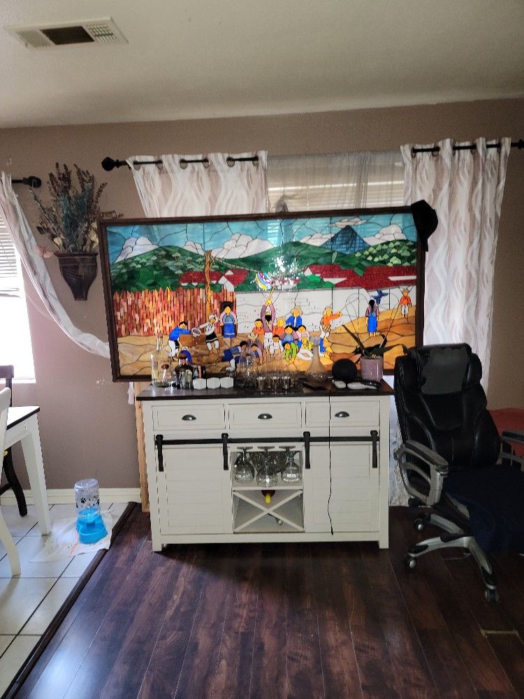 7 by 4 mural of pinata sceen . This art piece is framed and sitting on top of a bar island with wine rack and cabinets. All for sale. Must sell both pieces. Stainedglass art work