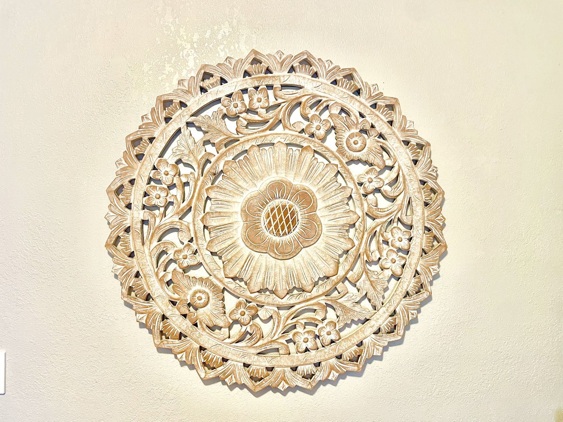Pier 1 carved wood medallion with an off-white finish. It features intricate floral and mandala-like designs.