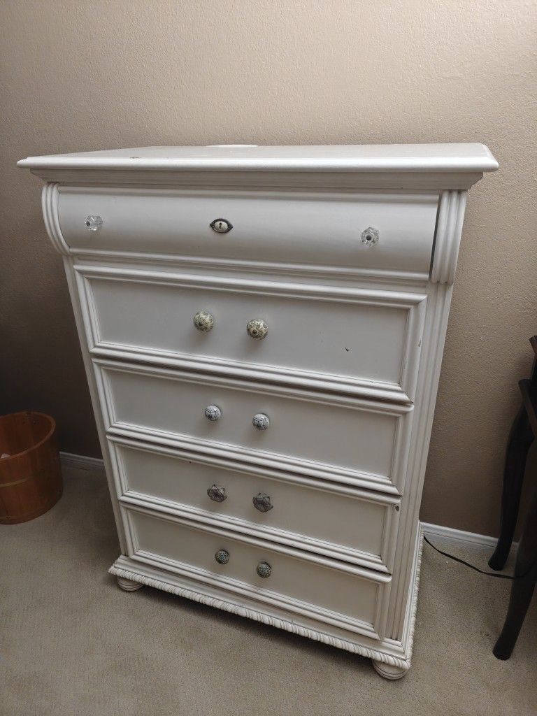 Price: $85 OBO Location: Oceanside, CA Pickup only Charming vintage white dresser with all custom, mixed hardware that gives it a one-of-a-kind look. Solidly built and surprisingly spacious—great as a bedroom dresser, entryway storage, or even a statement piece for a guest room. Dimensions: • 47.5” tall • 34” wide • 18.5” deep Why you’ll love it: ✔ Custom knobs & pulls on every drawer (no builder-grade hardware) ✔ Solid construction (not flimsy MDF) ✔ Smooth-gliding drawers ✔ Pretty lined drawers with floral paper ✔ Neutral white finish that fits farmhouse, cottage, shabby chic, or vintage styles ✔ Perfect size for apartments, condos, or smaller rooms Condition: Good vintage condition. Some cosmetic wear consistent with age—please see photos for details. Priced to sell and open to reasonable offers. Message me if you’d like to come take a look!