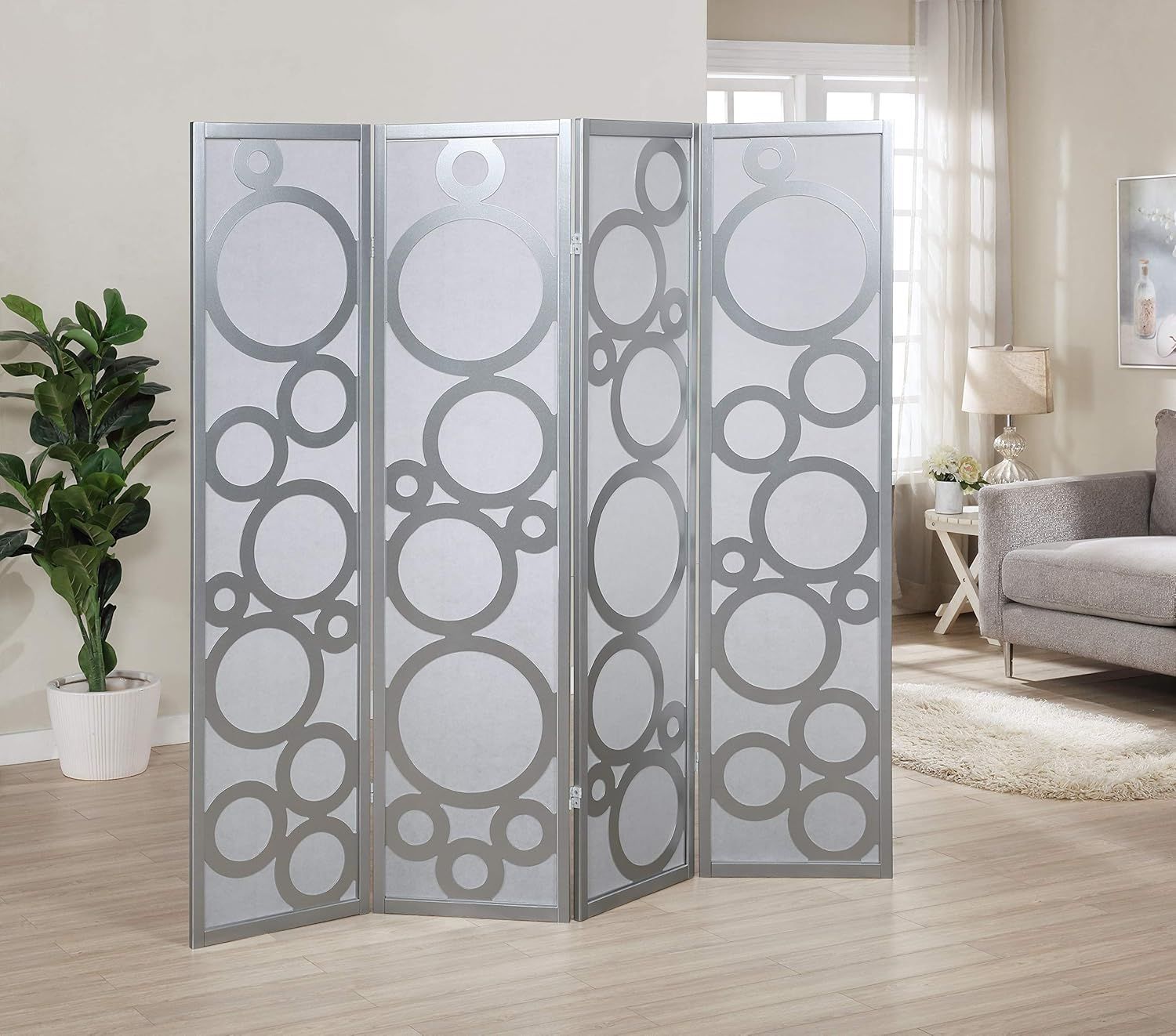 70" 4-Panel Silver Screen Room Divider w/ Circle Pattern [NEW] **No Assembly Req