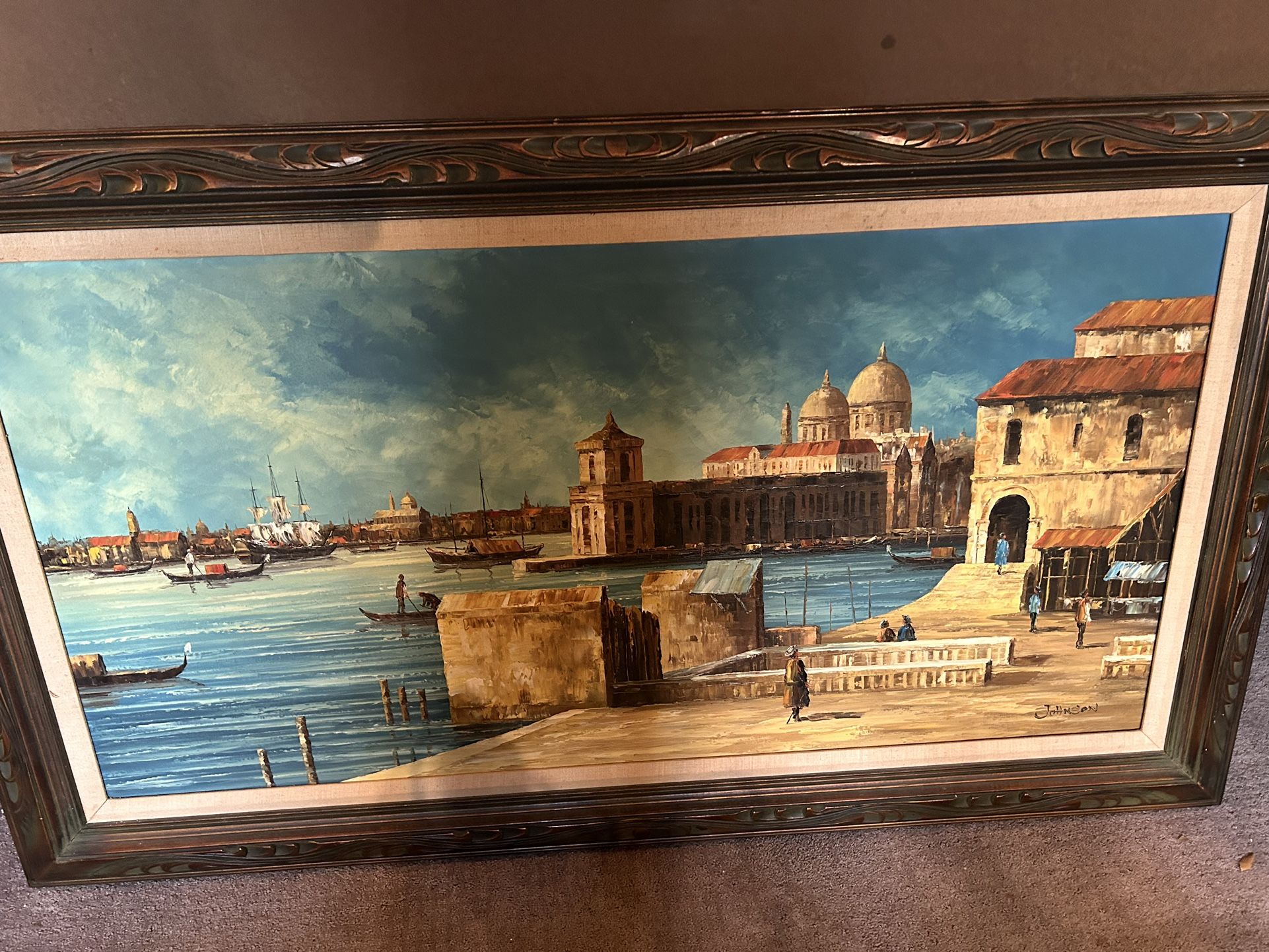 This large (55in diagonal) painting is in good shape. Wooden frame. Topic is the Port of Beirut in Lebanon.