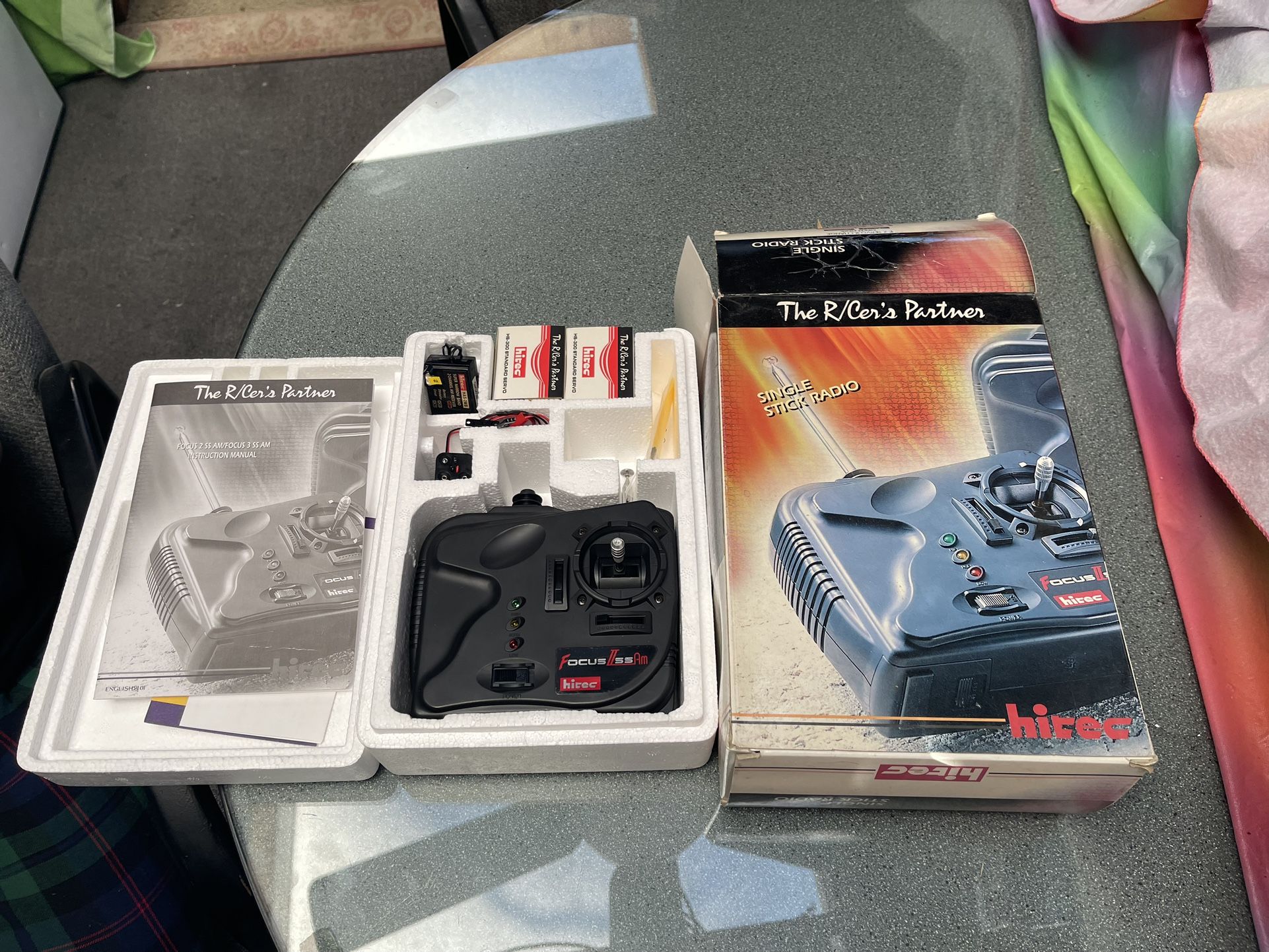 Hitec R/C car radio with 2 servos and receiver and battery case New in box
