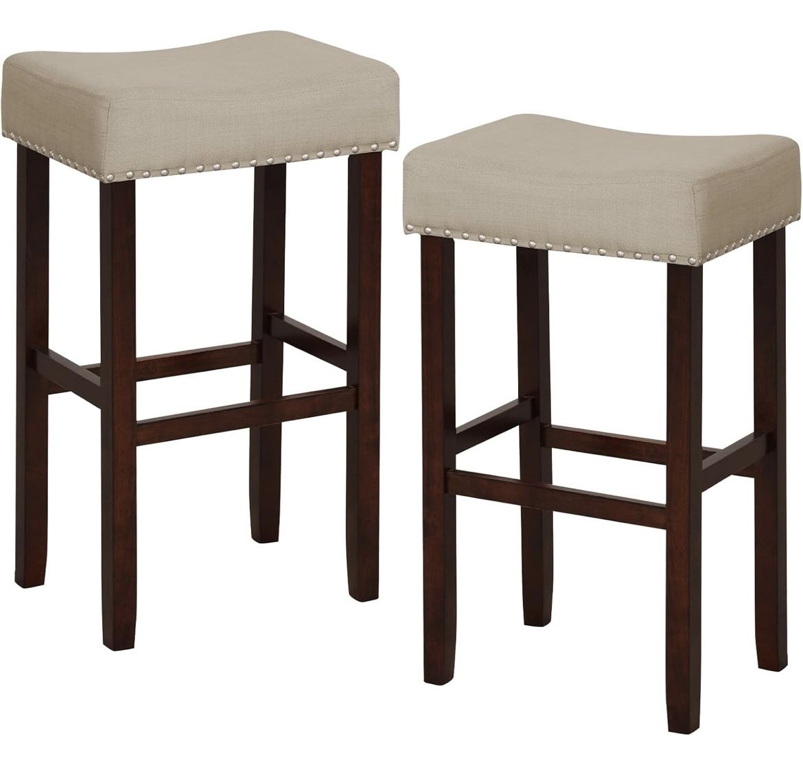 COSTWAY Counter Height Bar Stools Set of 2, 29.5-inch Backless Saddle Stools, Upholstered Barstools, Beige Product Dimensions 13"D x 17"W x 29.5"H Color Beige+brown Frame Material Wood Seat Material Type Linen Brand COSTWAY Size 29.5-Inch & Set of 2 【Comfortable Curved Saddle Seat】The curved seat cushion is filled with high-density sponge and designed in ergonomic saddle shape for optimal comfort. In addition, upholstered in premium linen fabric, the seat is soft and skin-friendly for easy maintenance. Also it is wear-resistant for great durability. 【Solid Rubber Wood Frame】It is the selected material that makes the saddle stool set stand out. Solid rubber wood legs and footrest show perfect performance in higher stability and excellent durability. Moreover, 330 lbs strong weight capacity of each stool provides ultra reliable support for each individual. 【Transformed Your Space】For diversified using needs, the 29.5” saddle stool set is compatible with 40"-43" counters or kitchen islands. For the purpose of saving space, the backless design makes this stool set be stored under the table when not in use. 【Retro Look & Clean Lines】This bar stool set features retro look and brown wood frame, adding a unique style to your home. Additionally, the exquisite nailhead trim design also increases the artistic sense, which is ideal for your kitchen, dining room or bar. 【Easy Assembly & Product Size】All hardware and parts are given the number, and assembly steps are shown in the picture of instruction. In addition, the smooth surface saves much time and effort in daily maintenance. Overall Dimension: 17” x 13” x 29.5” (L x W x H)