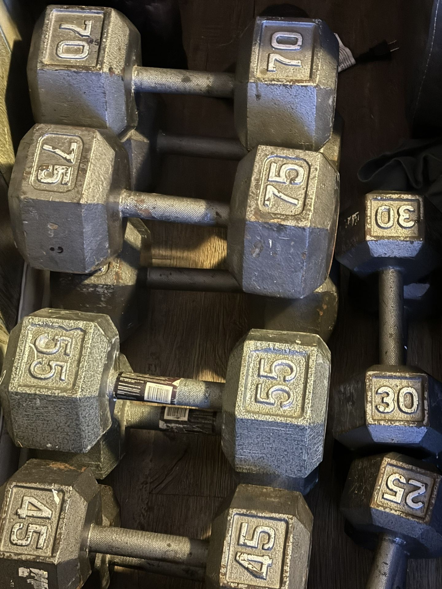 $1 per pound sets ……$1.25 per pound singles rubber and iron ….. iron Dumbells sets of 5s to 75s rubber 5s to 50s