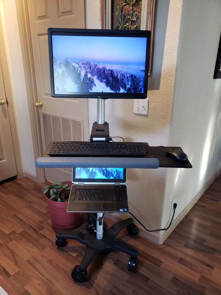 Stand includes adjustable keyboard/mouse support, keyboard, mouse, monitor support. Additional options are to include Dell professional 22" monitor. $50 23" monitor $60 Support shelf 14x11" for laptop or desktop rated 30lb. $30 $150 for stand with out monitor or lower shelf. , and $200 as a complete set. Few available and if you have questions, just ask.