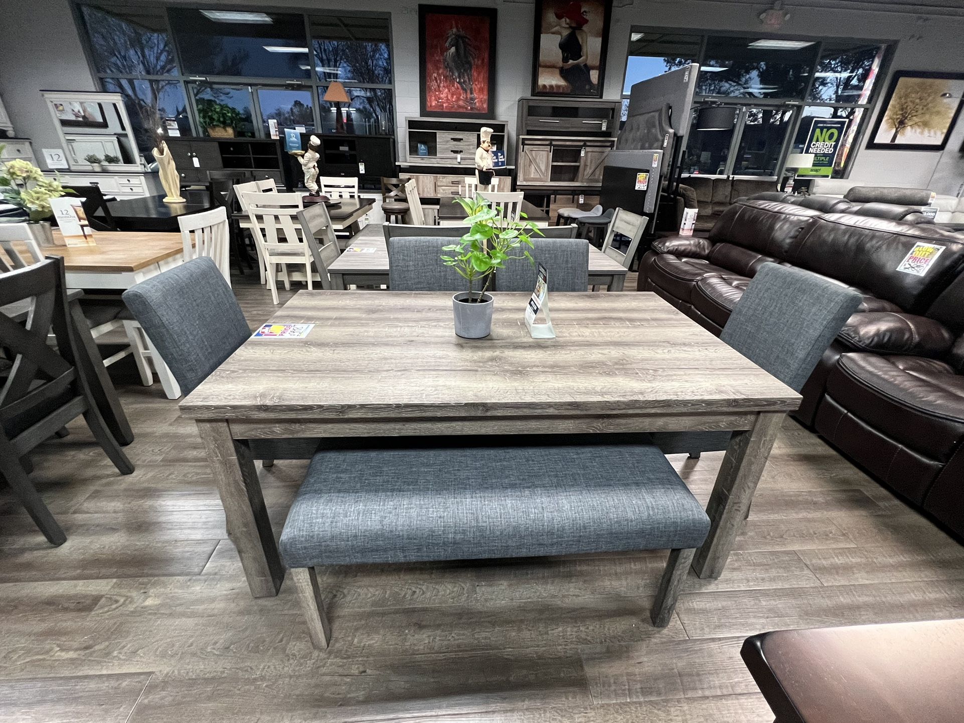 Includes: a table, 4 chairs and a bench Come check it out at: Mirage Modern Furnishings 1021 Hume Way Vacaville 95687