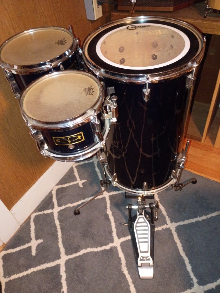 Great for small stages, practice places, but still has big sound for larger venues. Has Heavy duty chain drive Bass pedal. Cowbell with arm. Cymbal post with hihat bracket. 15x25 Bass, 10" tom, 8" snare, Aquarian bass head, Remo renaissance snare and tom skins.