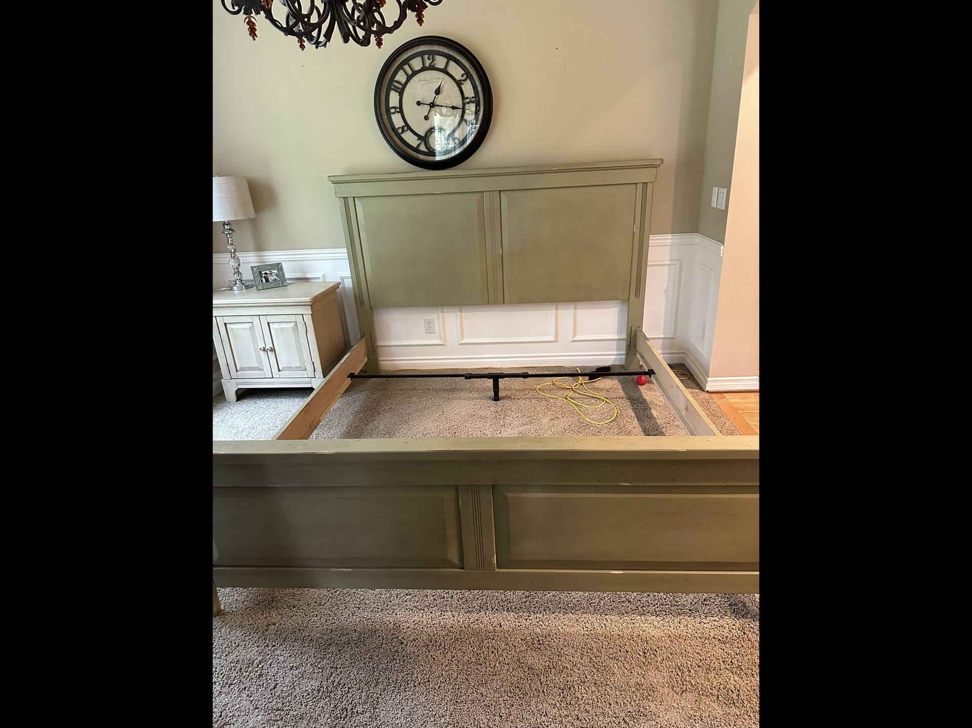 King size bed, two nightstands and a wall entertainment center all Broyhill full wood perfect condition! Distressed wood the bed is a sage green color and the nightstand and entertainment center are off-white.