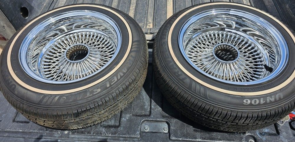 Set of old school Daytons on new tires just been sitting in garage. Stamped 225 A in back as seen in pic. **No adapters & knockoffs** Just rims & tires.... rims been sitting for awhile and just put new tires a few months ago... asking $2,200 obo