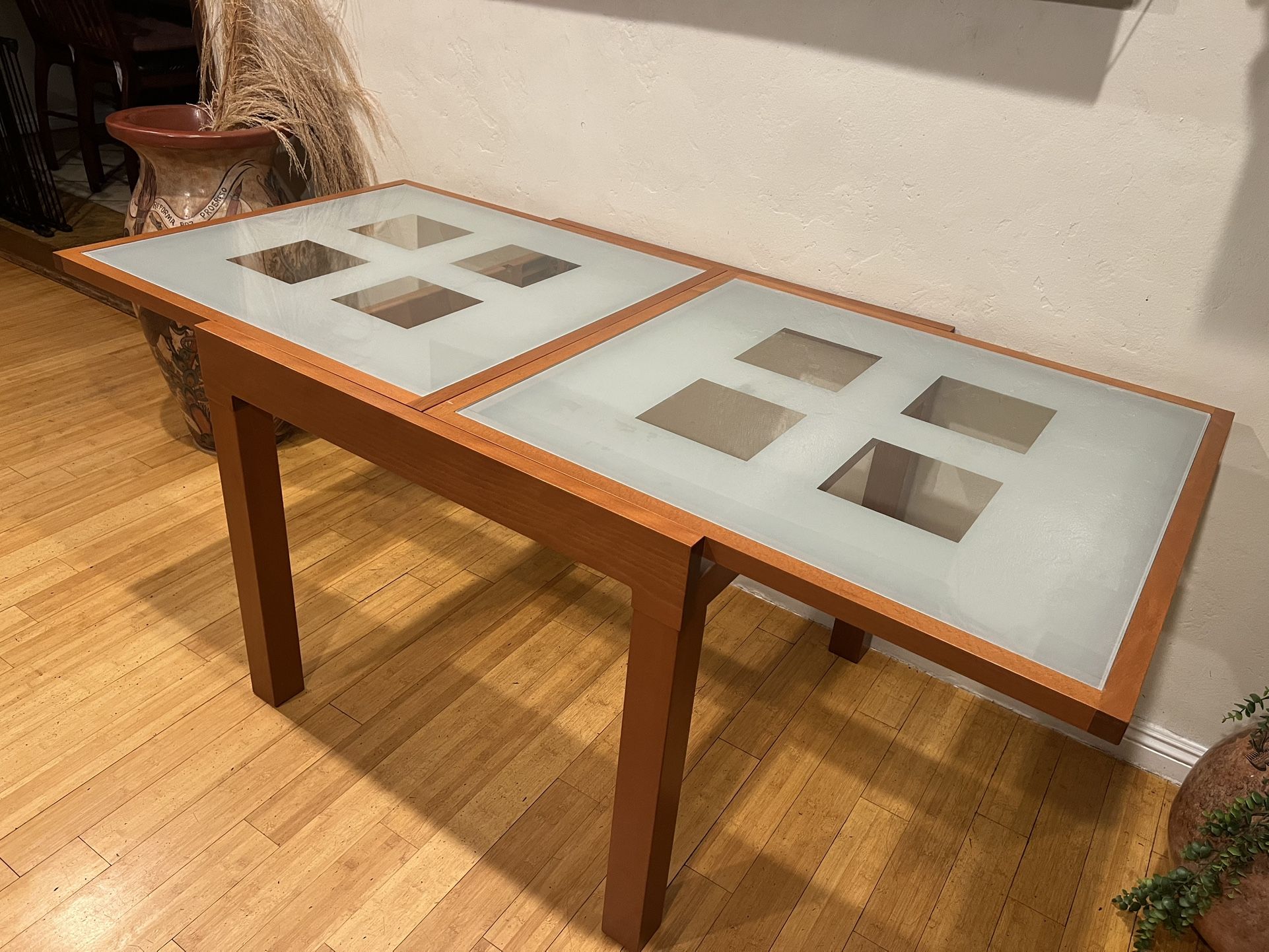 Frost glass top expandable table. 35 x 35” at single setting. When expanded, the table reaches 71 inches. The table is 30 inches tall.