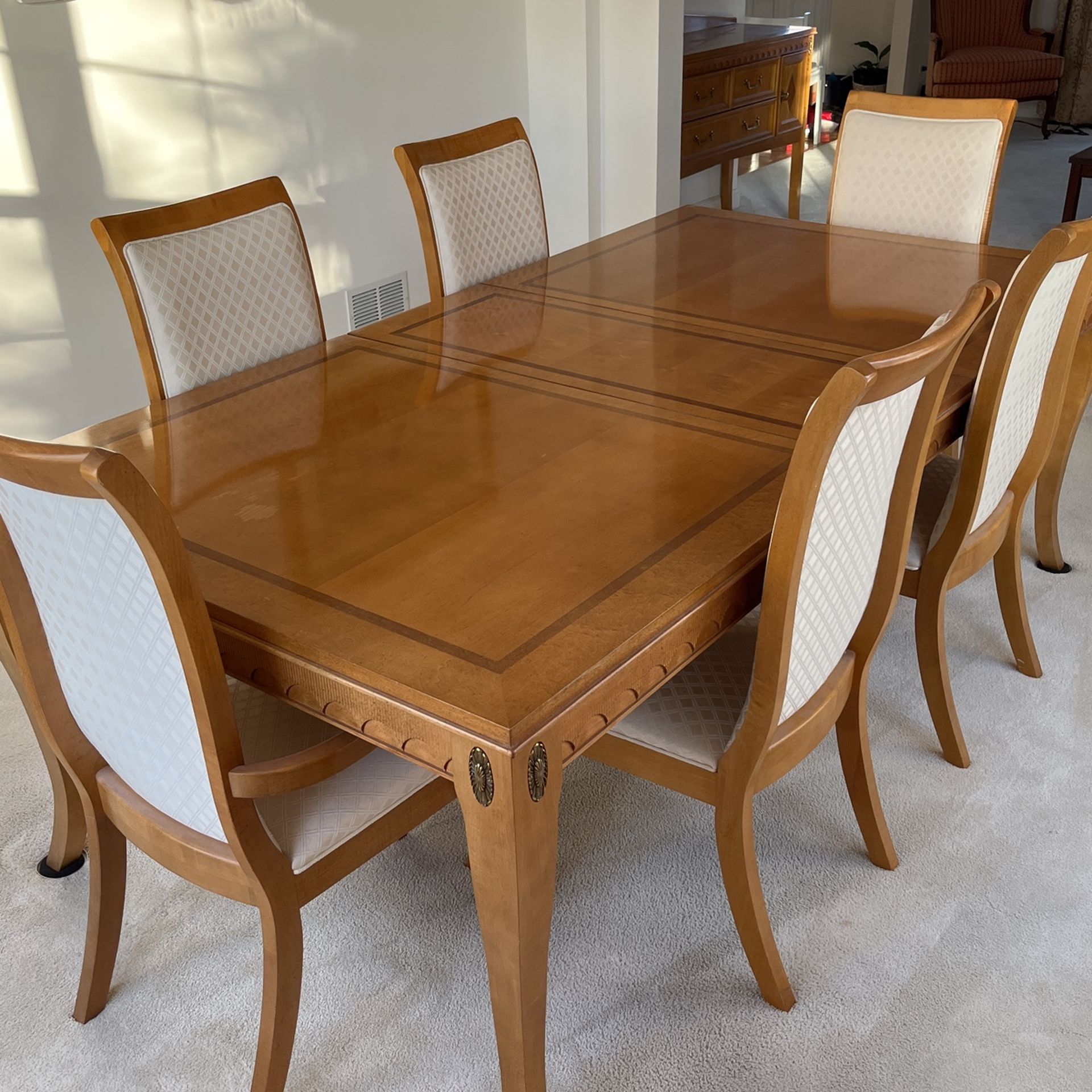 Formal Dining Table with 6 Chairs 68” x 44” without additional leaves. Each leaf adds 16”. With both leaves table is 100”. Matching sideboard is also available.