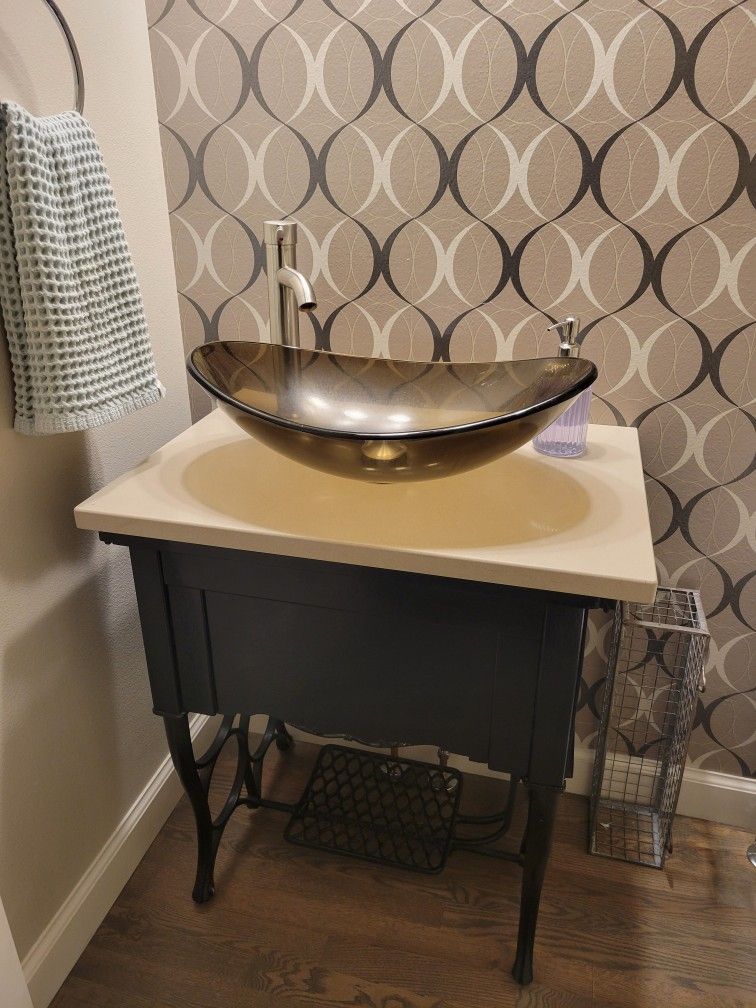 Bottom of sink is a working cast iron sink. Top is marble w/ glass bowl and working faucet.