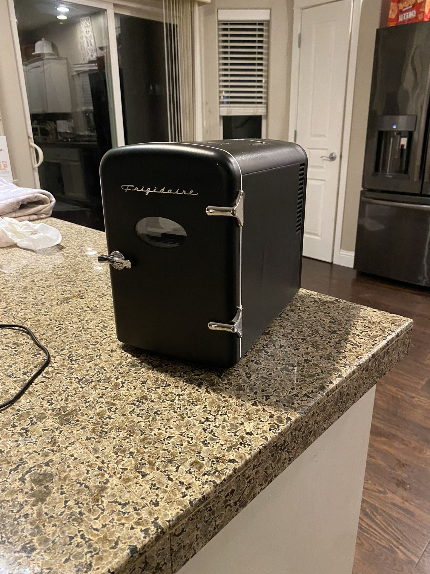 Plug in mini fridge good for snacks and sodas in a office or den.
