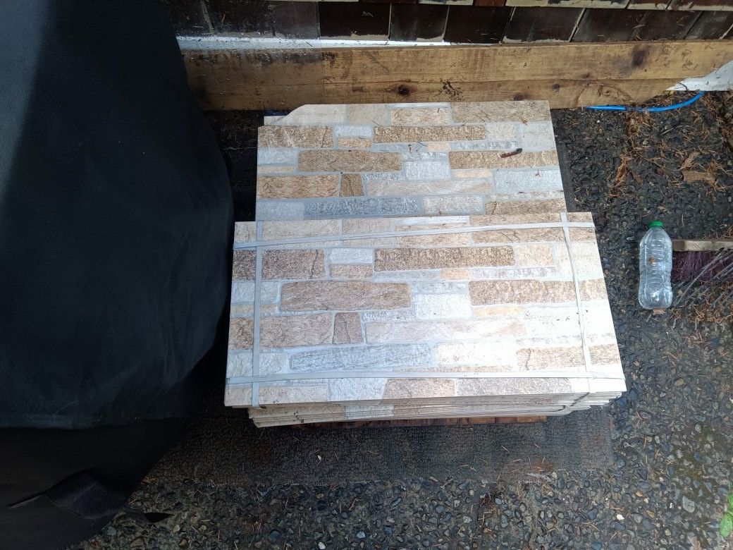 Roughly 90 square feet all together I believe. Enough to do a bathroom shower or laundry room. 12"x24" pieces.120.00 OBO just throw me in price