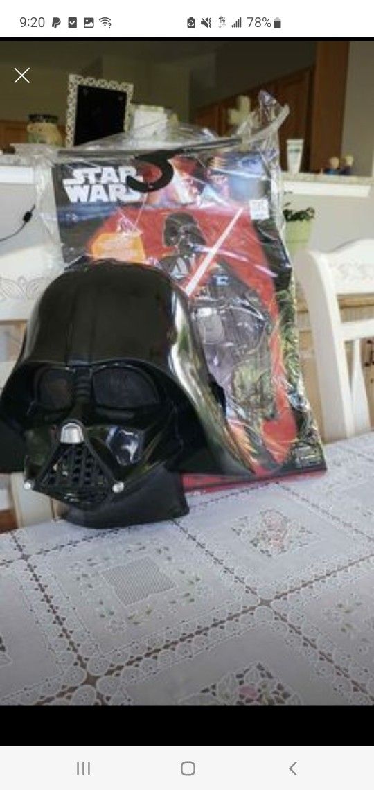 Dark Vader ,comes with attached collar ,chest peice ,and boot tops ,mask ,cape ,belt size large 12-14 and one that just says large .