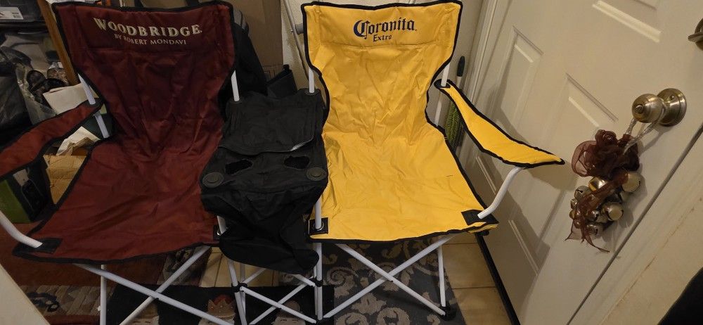 Brand New Yellow chair says Corona and red chair says Woodbridge There is a cooler in between them for ice and drinks and has a velcro cover.