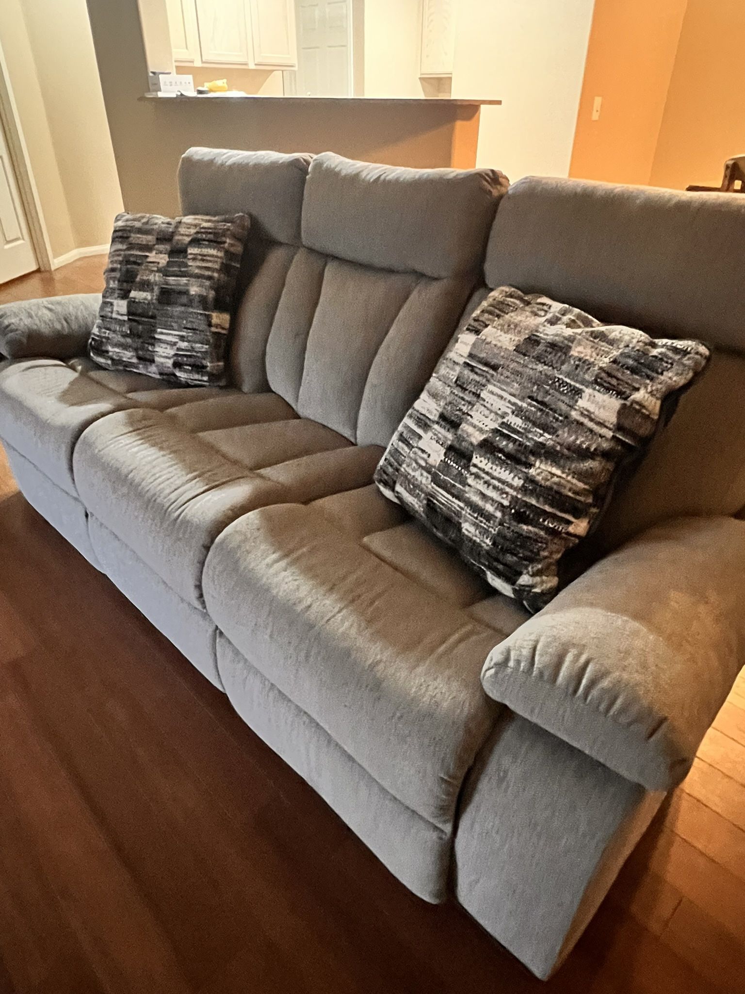 Signature Design by Ashley Reclining Living Room Set. This set is practically brand NEW, 5 year warranty included, owned by one adult less than a year, and comes from a pet-free & smoke-free clean home. Features smooth pull-tab reclining for both sofas, built-in USB charge ports in center console for phones, tablets & devices, two cup holders & hidden storage for essentials. Soft cushioning polyester upholstery in a modern gray/white/beige hue. Price drop from $900>> $800 for BOTH (full set) Great value!!Serious buyers welcome!