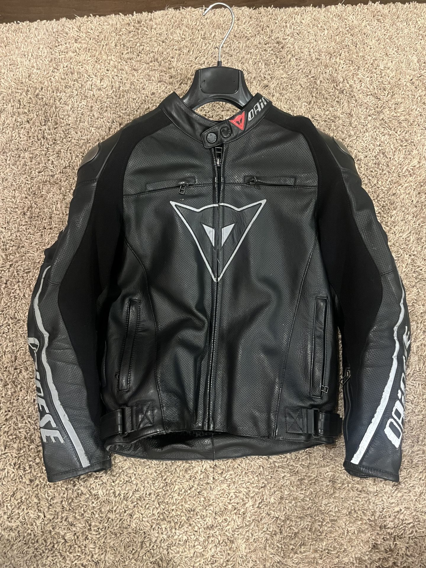 Dainese size 46, leather perforated jacket. Has the air hump and titanium shoulder armor. Includes an alpine star level 2 back protector. Never touched ground, so no damage.