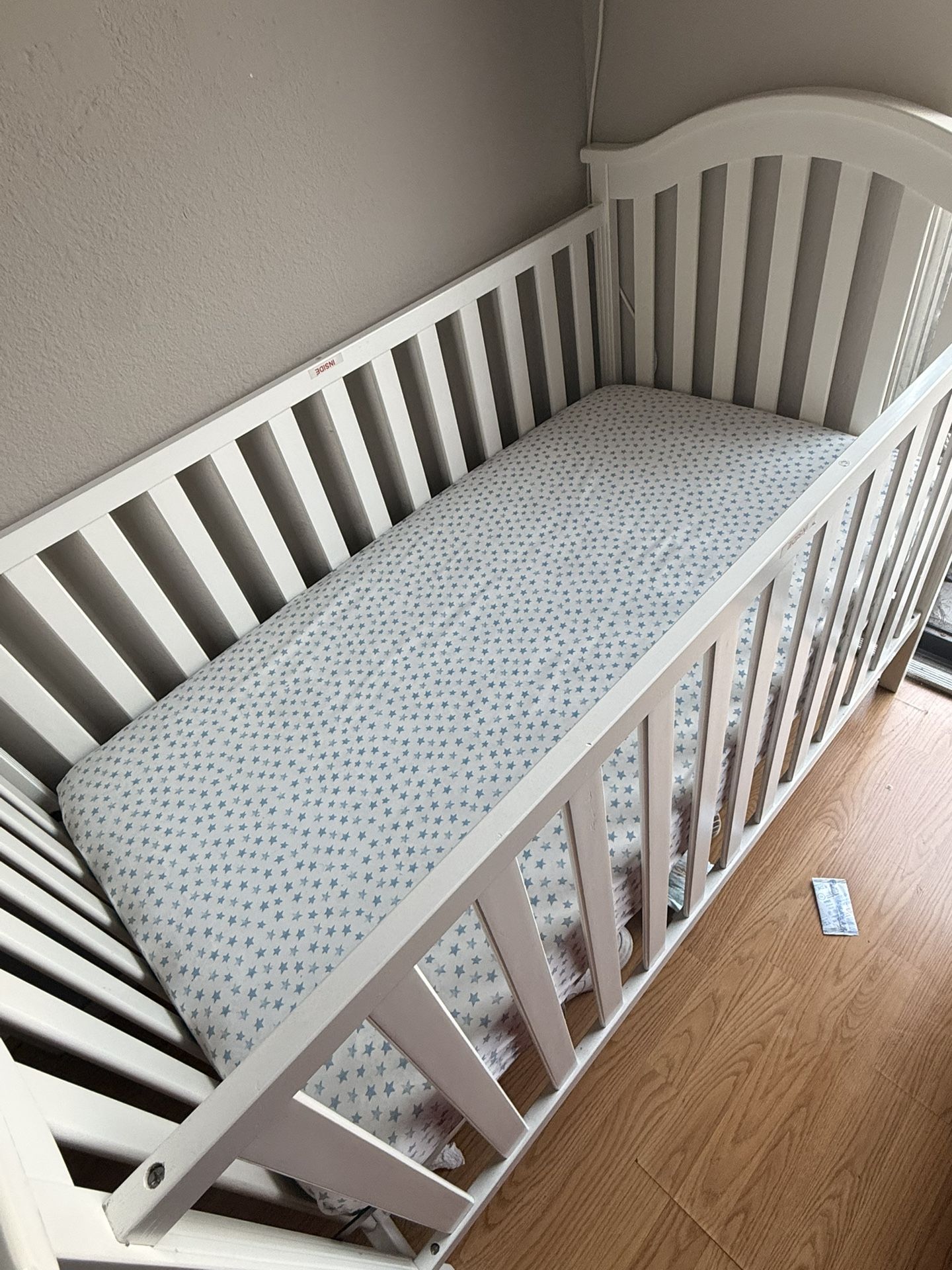 Got this crib. For my baby but she never use it. She would fuss a lot so my baby sleeps with us. There’s no box to put it in. If you have one best to bring it. Basically brand new. Selling it with the mattress and brand new sheets for it.