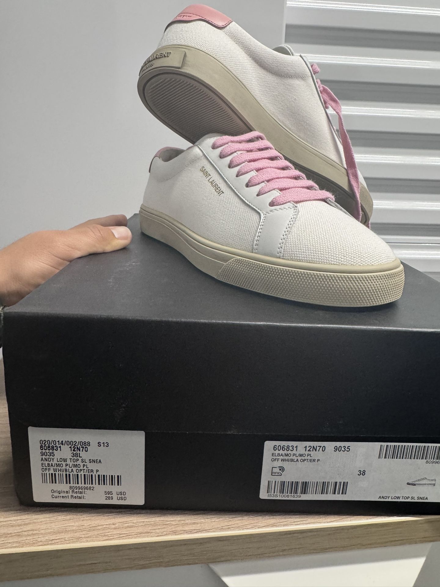 Authentic never worn. Off-white canvas with pink lances/heel. Original box.