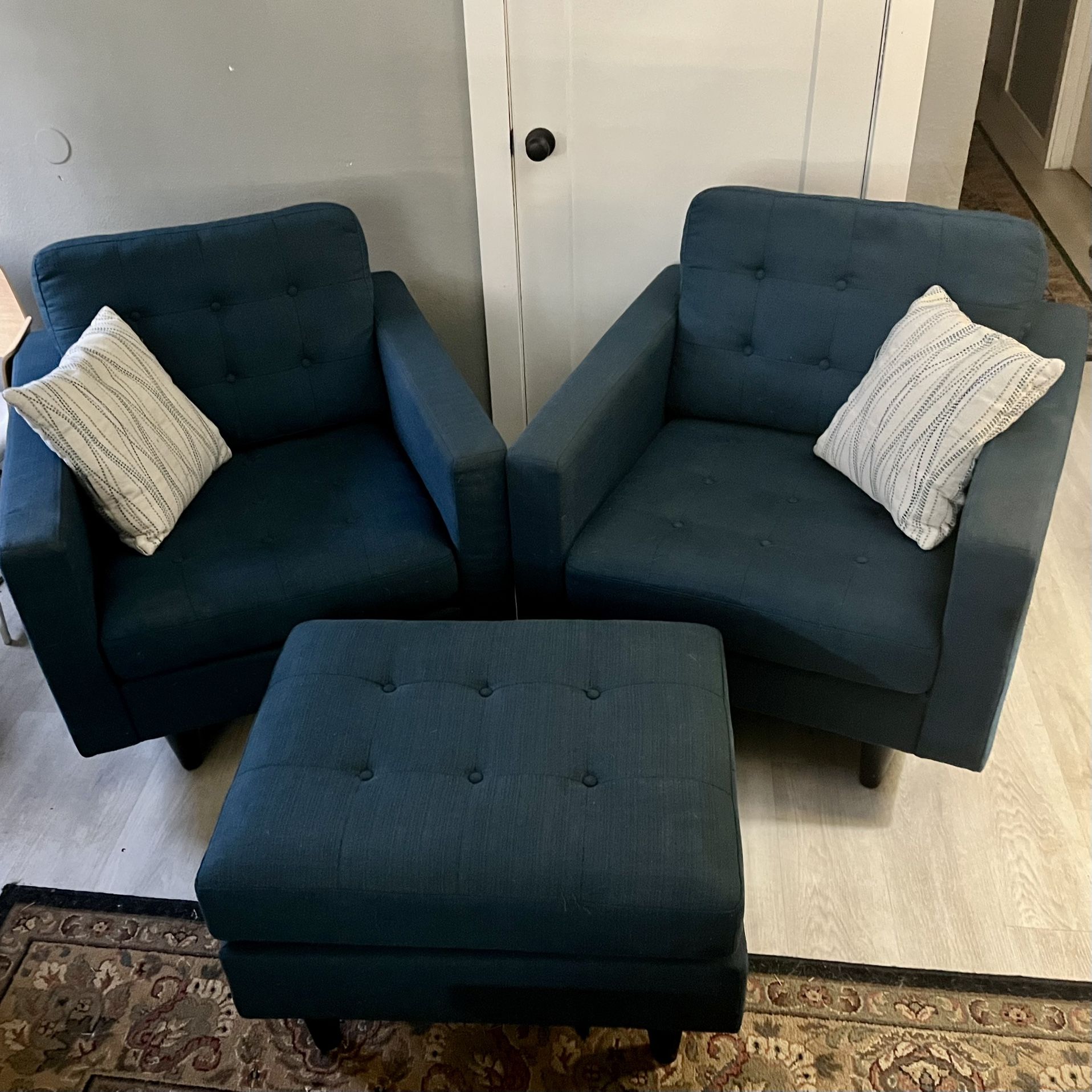 2 beautiful blue tweed armchairs sharing 1 ottoman, and a couple accent pillows. Some slight kitty pulls as seen in closeup pics but hardly noticeable. Were $500 each new, I'm asking $250 for all. Pick up in Arlington or I can deliver cheap if needed