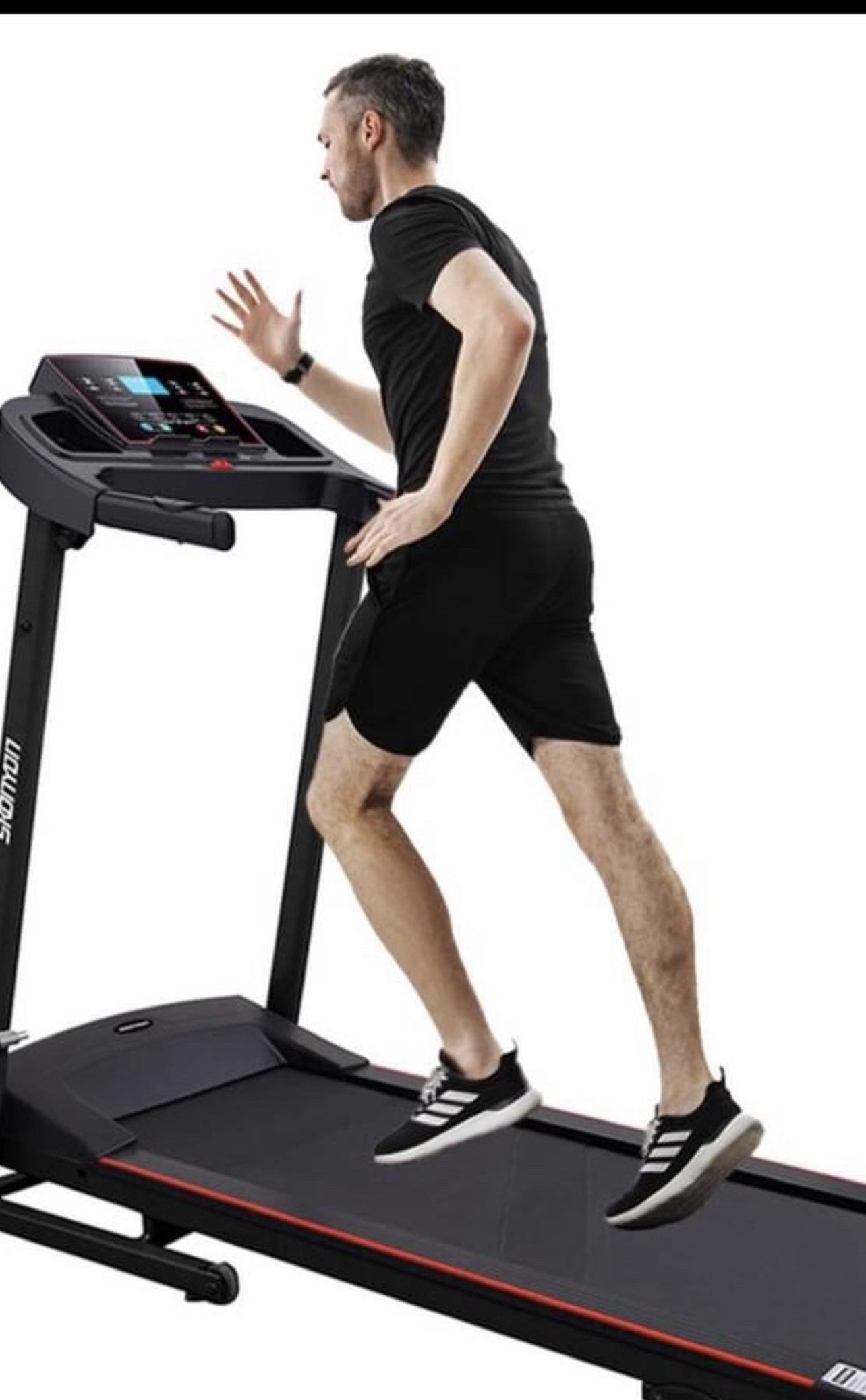 Multi-Functional LED Display Electric Folding Treadmill 2.0HP for Home Use, Easy Assembly Compact Running Machine with Speaker and Cup Holder Enjoy a quiet workout with a powerful motor perfect for walking, jogging and running in the comfort of your own home, speed ranging between 0.3-7.5 MPH. 12 built-in workout programs to follow on the front facing LCD screen so you can switch up your workout and challenge your body. Designed to be similar to treadmills you can find at any commercial gym, this treadmill is manufactured with high-grade materials and is equipped with a 2.0HP motor supporting up to 220LBS. Treadmill frame manufactured for user-friendly folding so you can save valuable space, store and transport with ease. Description: DIGITAL DISPLAY: Track distance, speed, time, and calorie counts on the screen, while the handles have speed settings, start/stop buttons, and heart rate sensors PORTABLE DESIGN: Easily folds down, and built-in wheels make it even easier to roll it from one room to another so you can get a workout in anywhere around the house Specifications: Power: 2.0HP Rated voltage: 110V Speed range: 0.8-16Km/h Weight capacity: 220 lbs
