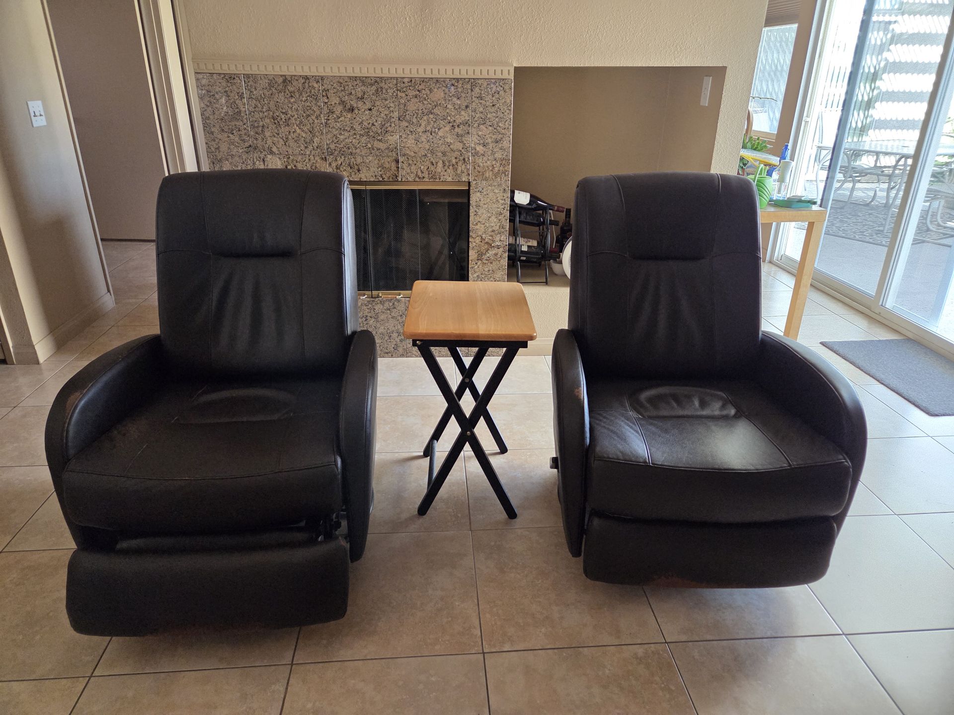 2 brown vinyl swivel, rocker, recliner chairs. 30" W x 34 " D x 39" H 1 chair has broken recliner handle will not recline without fixing, will swivel and rock, second chair operates perfectly. Rub marks on both. As shown, - free, no cost.