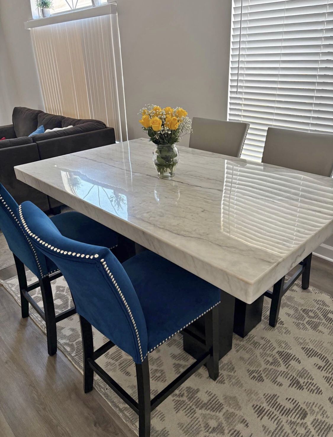 Marble top dinning table with black legs, with 4 high back chairs (2 blue / 2 Grey) used in a great condition. Just like new