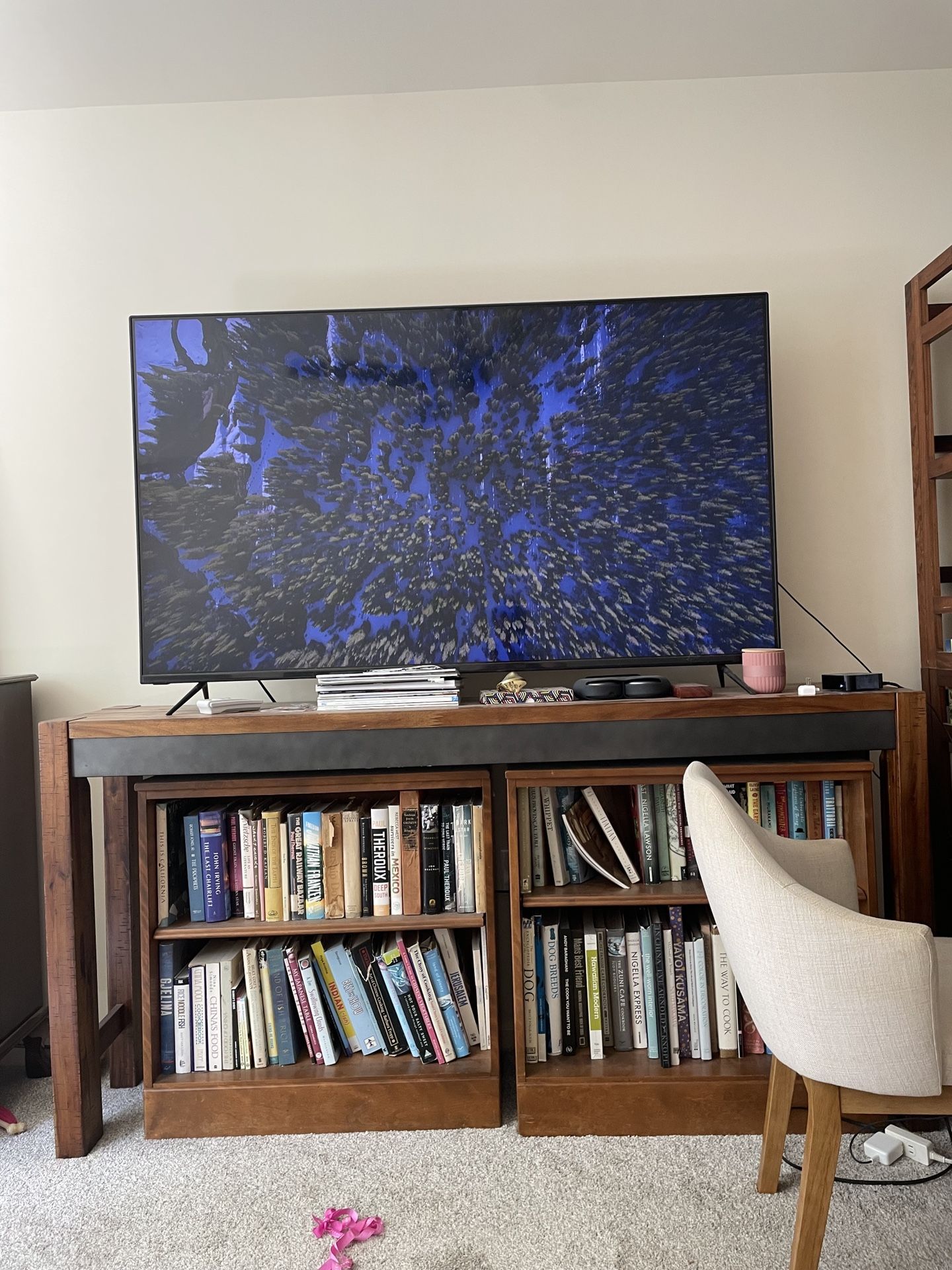 Available in January – 75” flat screen TV – Solid wood TV stand with built-in bookshelves – Dimensions: 6.1 ft (W) x 1.45 ft (D) x 3 ft (H) TV works great, stand is heavy and sturdy with a stylish wood + black metal look. Perfect for a living room or office.