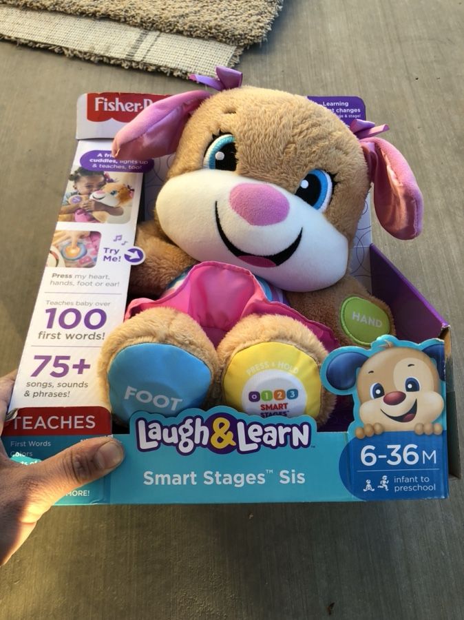 Laugh & learn $10 Hiking pack $30 Purple monkey $5 Bunny $2 Doll &horse $10 Blue floaty $8