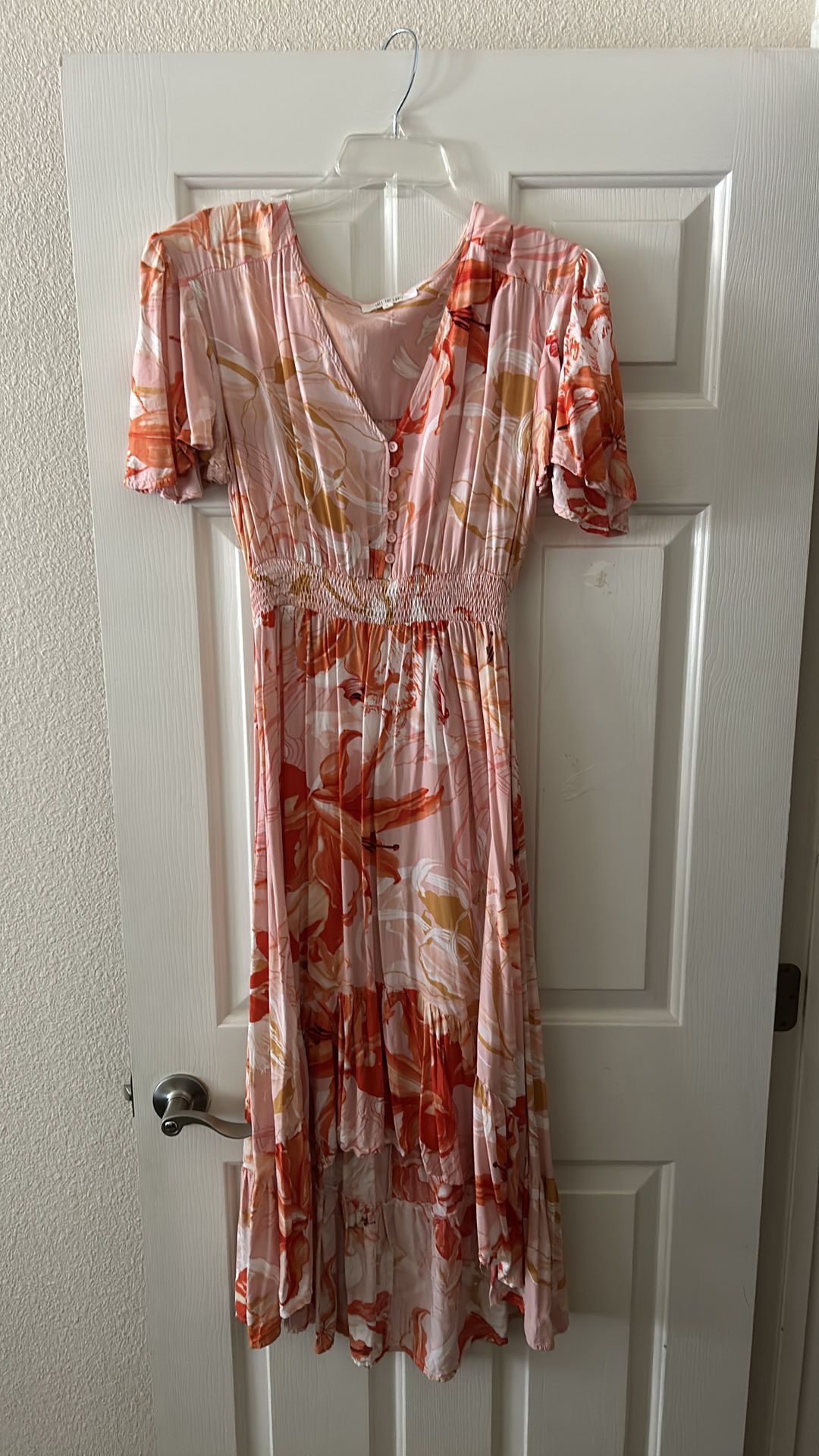 Mid length hi-low hem spring dress. Colors: lighter pink, orange flowers, dark yellow & white details. V neck , flutter sleeve- short sleeve, gathered waist, and 6 small button detail on chest. Only worn once. 100% rayon lightweight material. Size Large but fits like a size 10