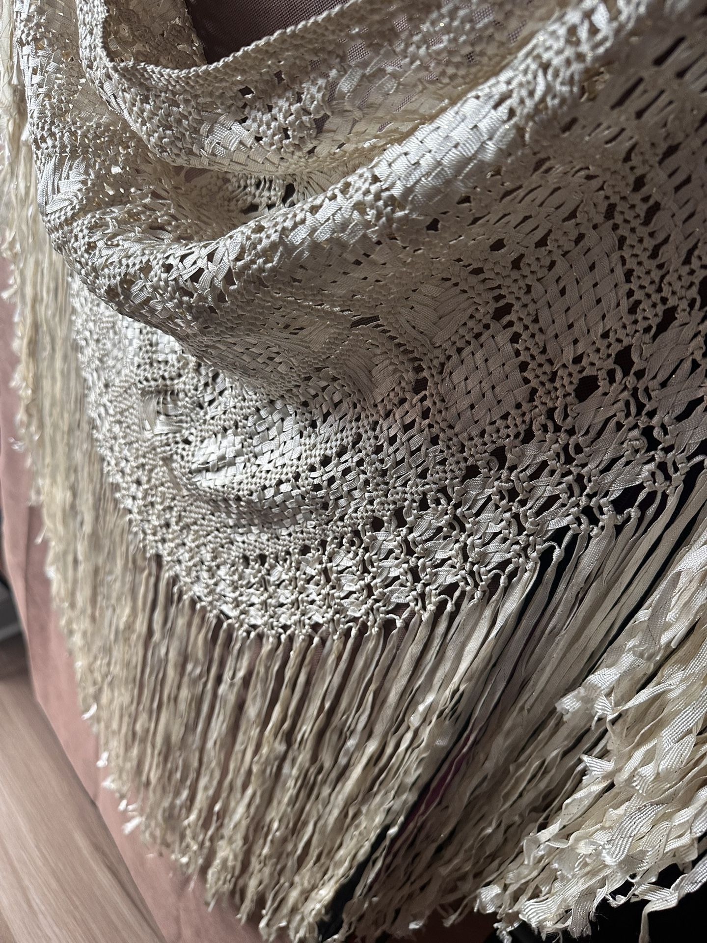 This exquisite square silk piano shawl features masterful hand embroidery with hand-knotted long silk fringes. (Vintage Spanish Bridal Flamenco silk Fabric embroidery)