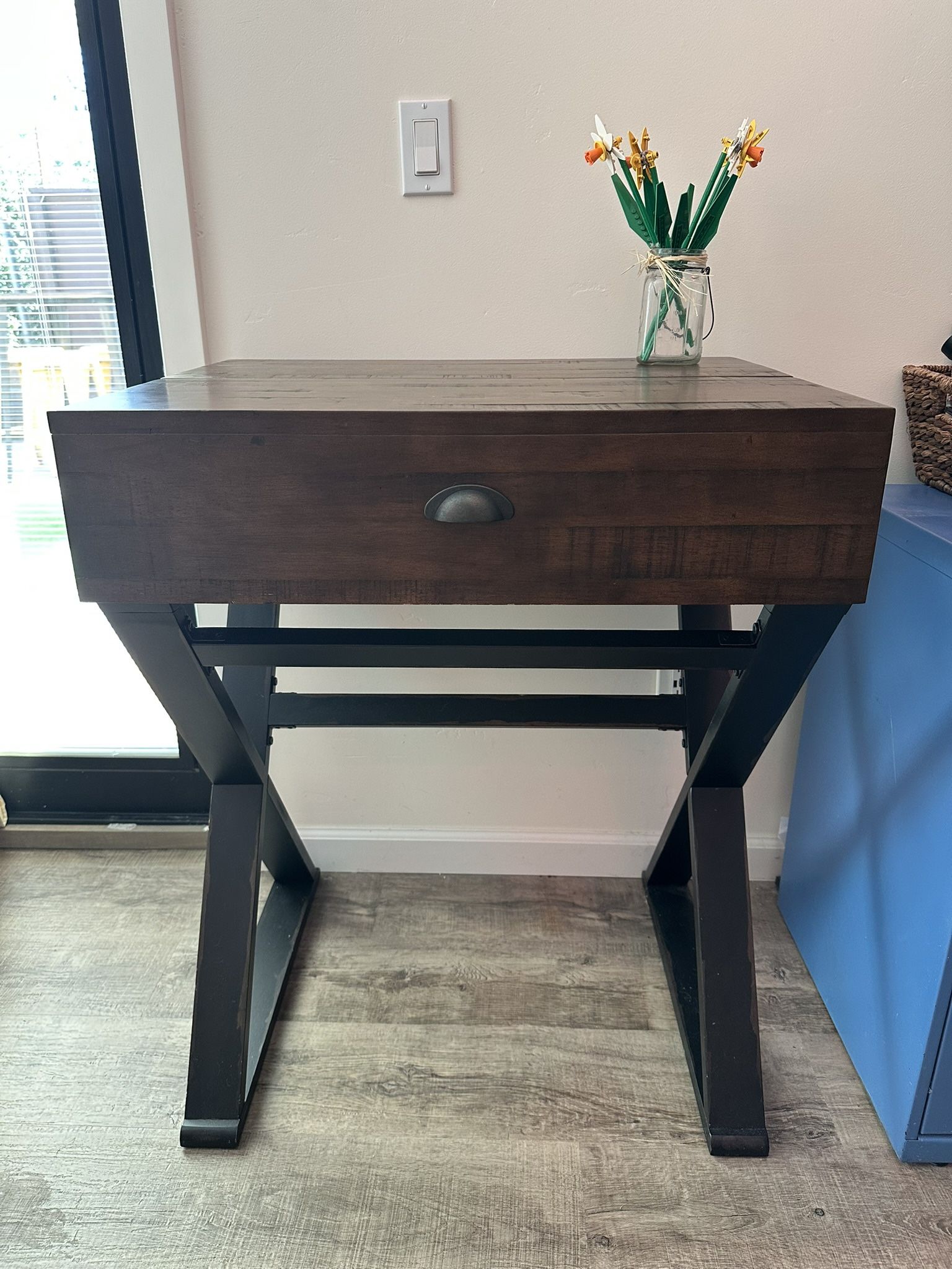 Made of distressed wood in two-tone antique.compact secretary desk. small home offices and workspaces. The top lifts to reveal shelf space, two drawers and a pullout tray for an extra work surface that doubles as a keyboard holder. Specifications Made of solid rubber wood with a distressed look 2 drawers 1 shelf 1 pullout tray Dust with a dry, lint-free cloth $75 Perfect condition