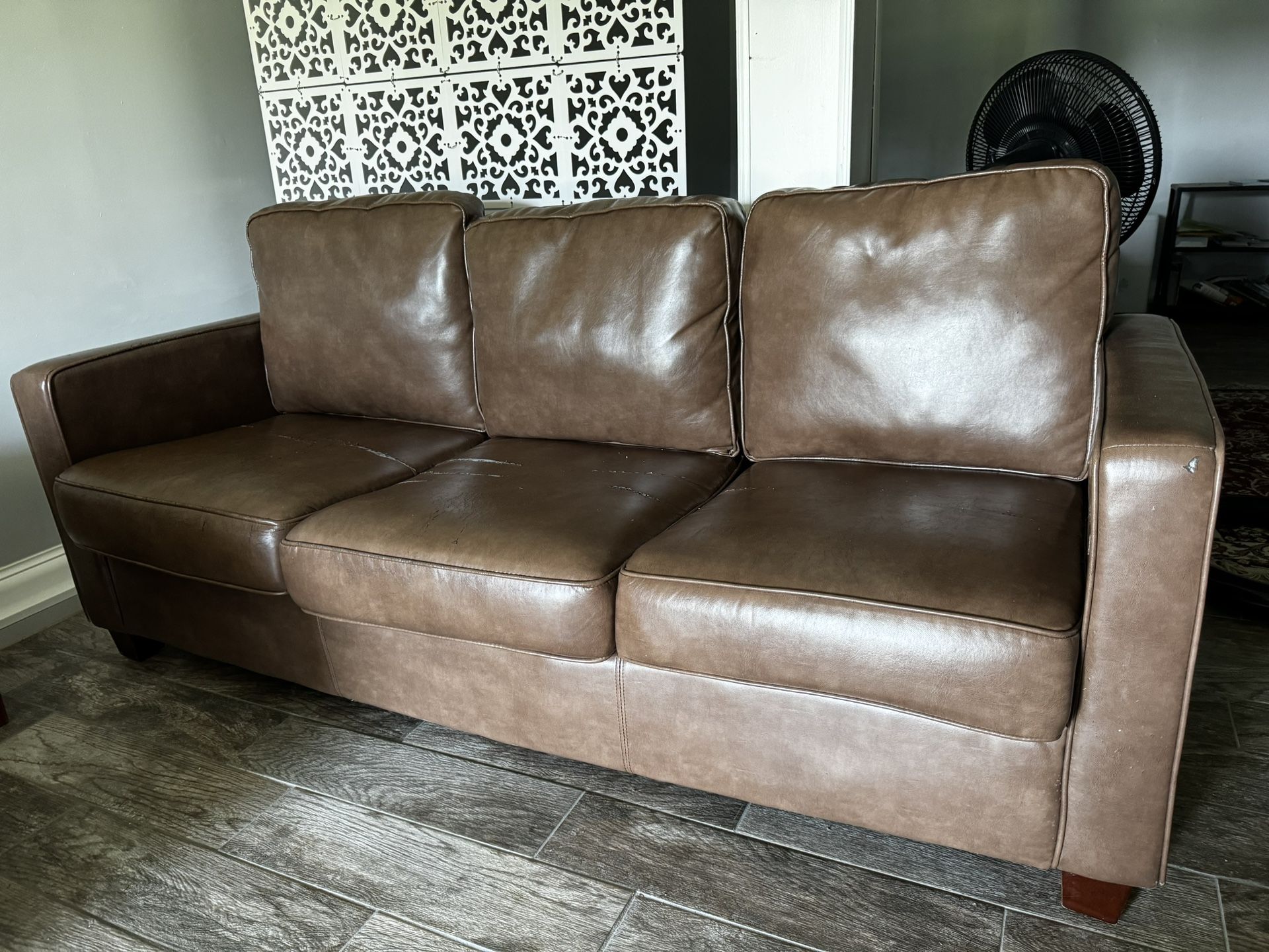 Brown Faux Leather Coach Has a few rips in the arm and seat cushions. Dimensions are 75 1/2 inches long x 32 inches wide x 35 inches high from the tallest point (the back).