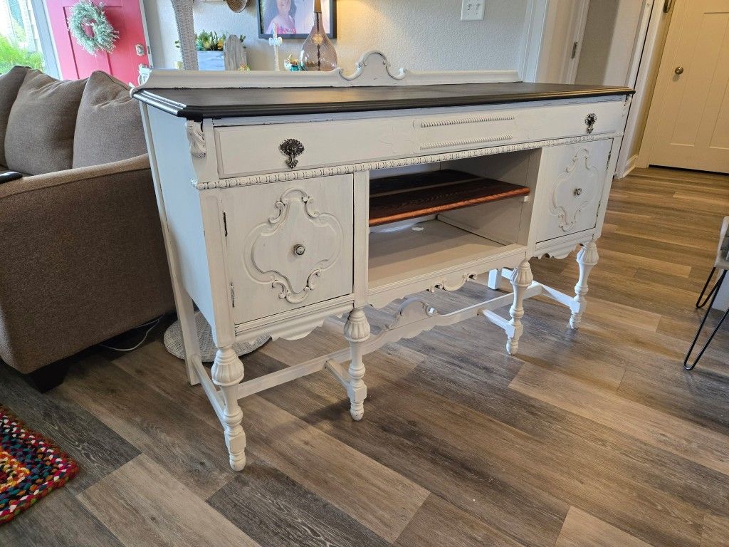 Absolutely gorgeous vintage buffet that has been painted in shabby chic style. Top is black chalk painted, rest is off white distressed. Has wooden removable shelf. Great as a TV stand or traditional buffet. All around fabulous piece, we just don't have room for it any longer. Dimensions 60 in. wide x 38 in. tall x 21 in. deep Cash only, must pickup.