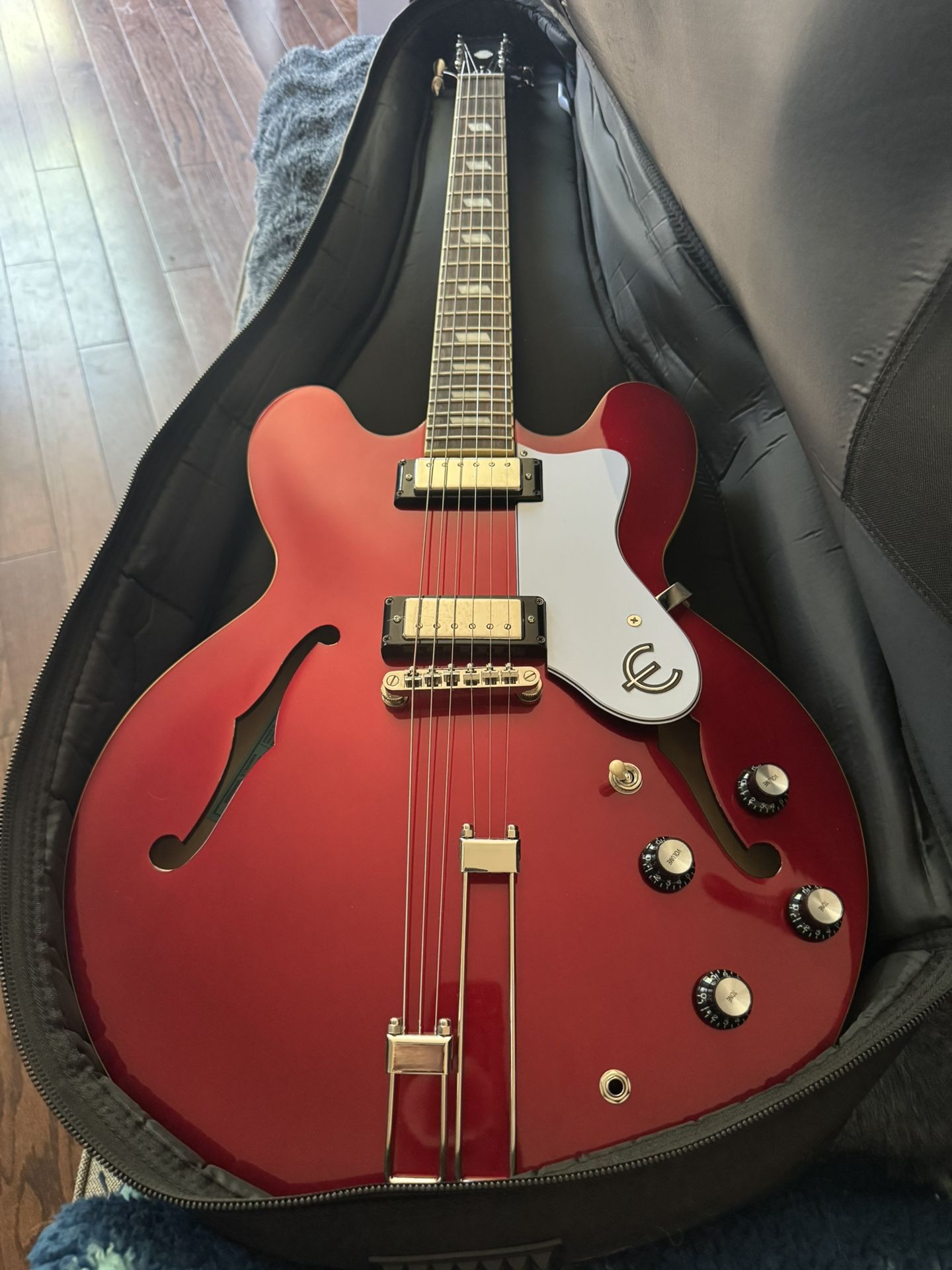 Used, Excellent condition with gig bag From manufacturer: The Epiphone Riviera, one of Epiphone’s original, most enduring classics makes a comeback! First introduced in the early ‘60s, the Epiphone Riviera’s semi-hollow design has been a favorite of players from all genres and generations including blues greats Robben Ford and Otis Rush, Lou Reed of the Velvet Underground, and The Strokes’ Nick Valensi, who have all found that the Riviera’s legendary ES™ body shape can produce great tones with any pickup variation. This Riviera features a layered maple top back and sides, a 3-layer pickguard with the classic metal Epiphone “E”, and comes equipped with Epiphone's LockTone™ Tune-O-Matic™ adjustable bridge and Frequensator tailpiece.