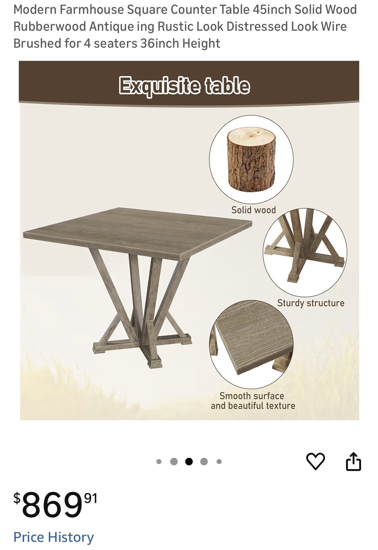 This is a Modern Farmhouse Square Counter Table. It's made of solid wood with a rustic, antique-inspired look. The table is wire-brushed and designed for 4 seaters. Get this table in time for your holiday meals.