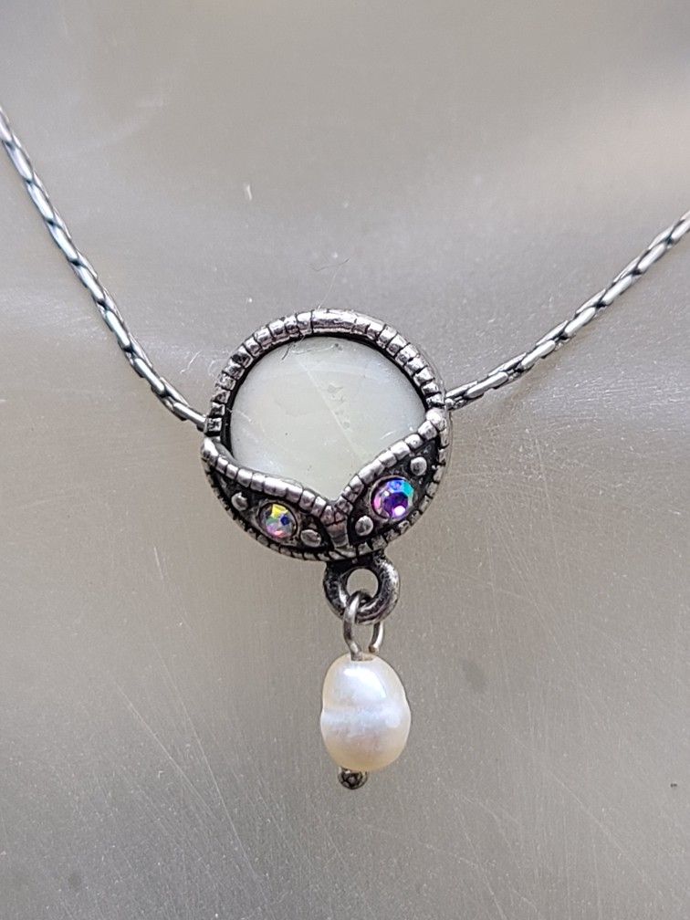 Magnificent MOON OVER MIAMI art deco designer necklace. Truly one of a kind it has shell inlay ACCENTED with aurora borealis crystals. It has a genuine freshwater pearl to match the shell. There is an embargo on abalone; therefore this cannot be duplicated. One of a kind. This can be worn for any occasion dress or casual. Fabulous look on. It is 18" long and is accompanied with a Lobster Claw clasp which includes a 2" extension. Exquisite gift for any holidays. From a smoke-free pet-free home. Please click on my profile to see all my other treasures. Thank you for looking and have a great day.